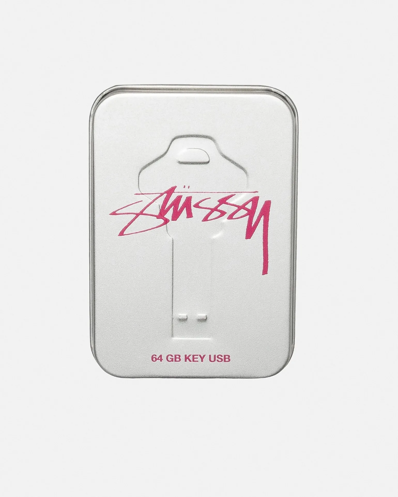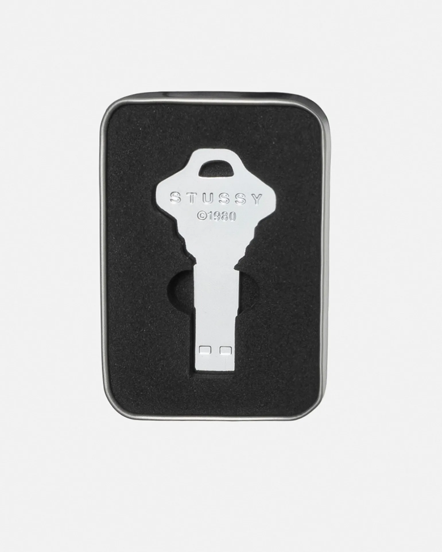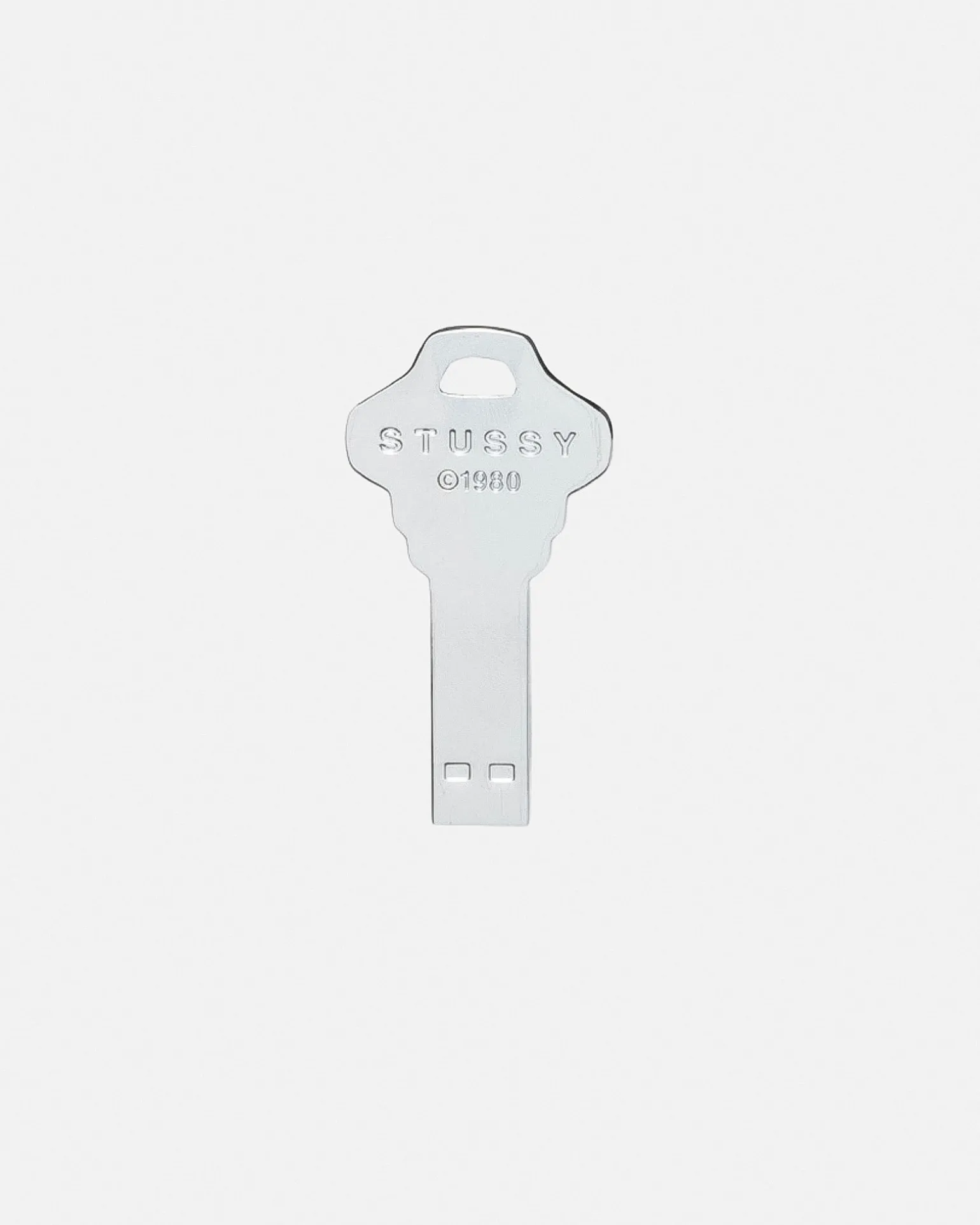Silberner USB-Stick in Schlüsselform. Tonal geprägtes Stüssy-Logo auf jeder Seite.