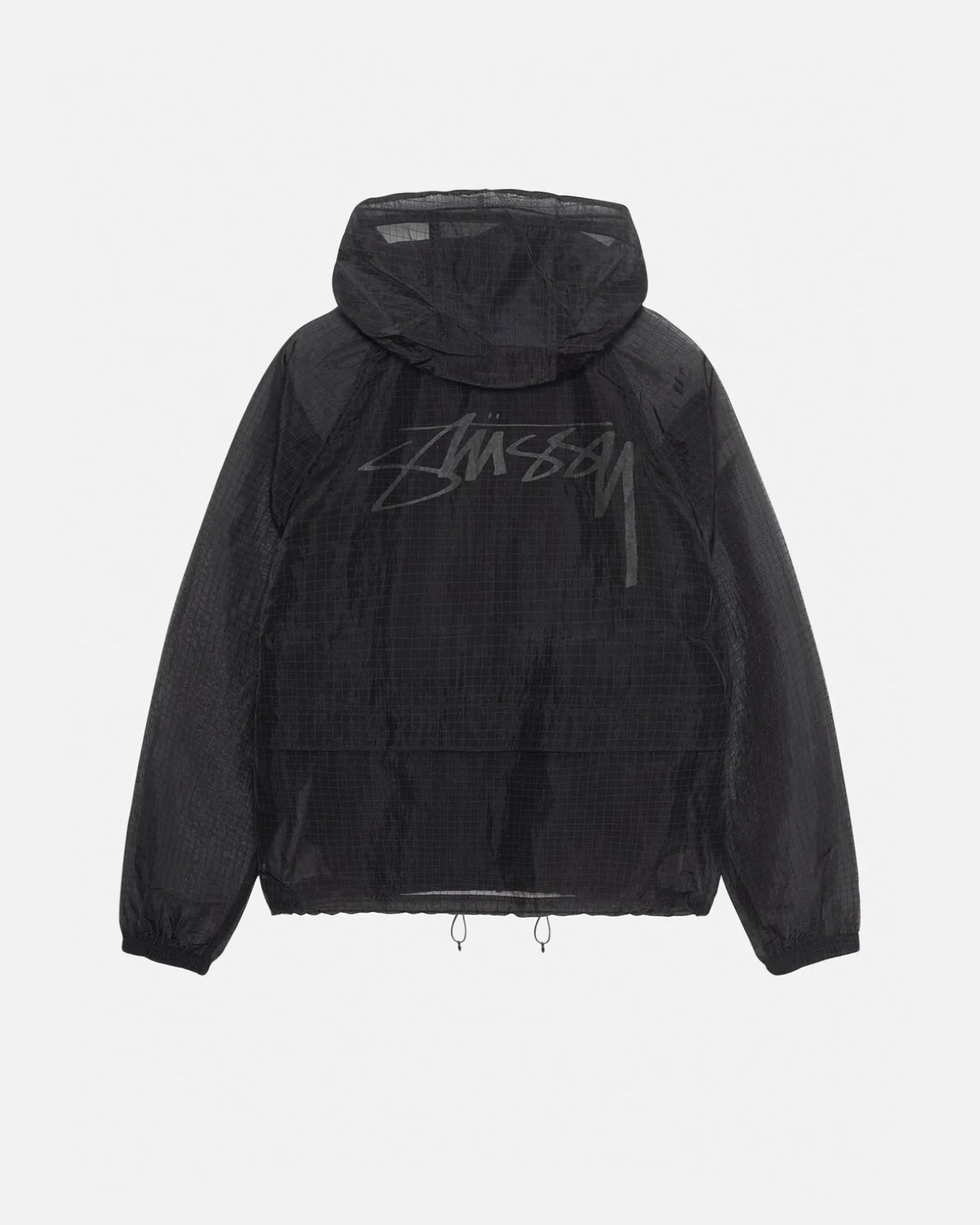 Weite Shell-Jacke aus transparentem Ripstop-Gewebe. Mit Reißverschluss an der Vorderseite und verstellbaren Kordelzügen an Kapuze und Saum. Tonales, gedrucktes Stüssy Smooth Stock Logo auf der linken Brust und auf dem Rücken.