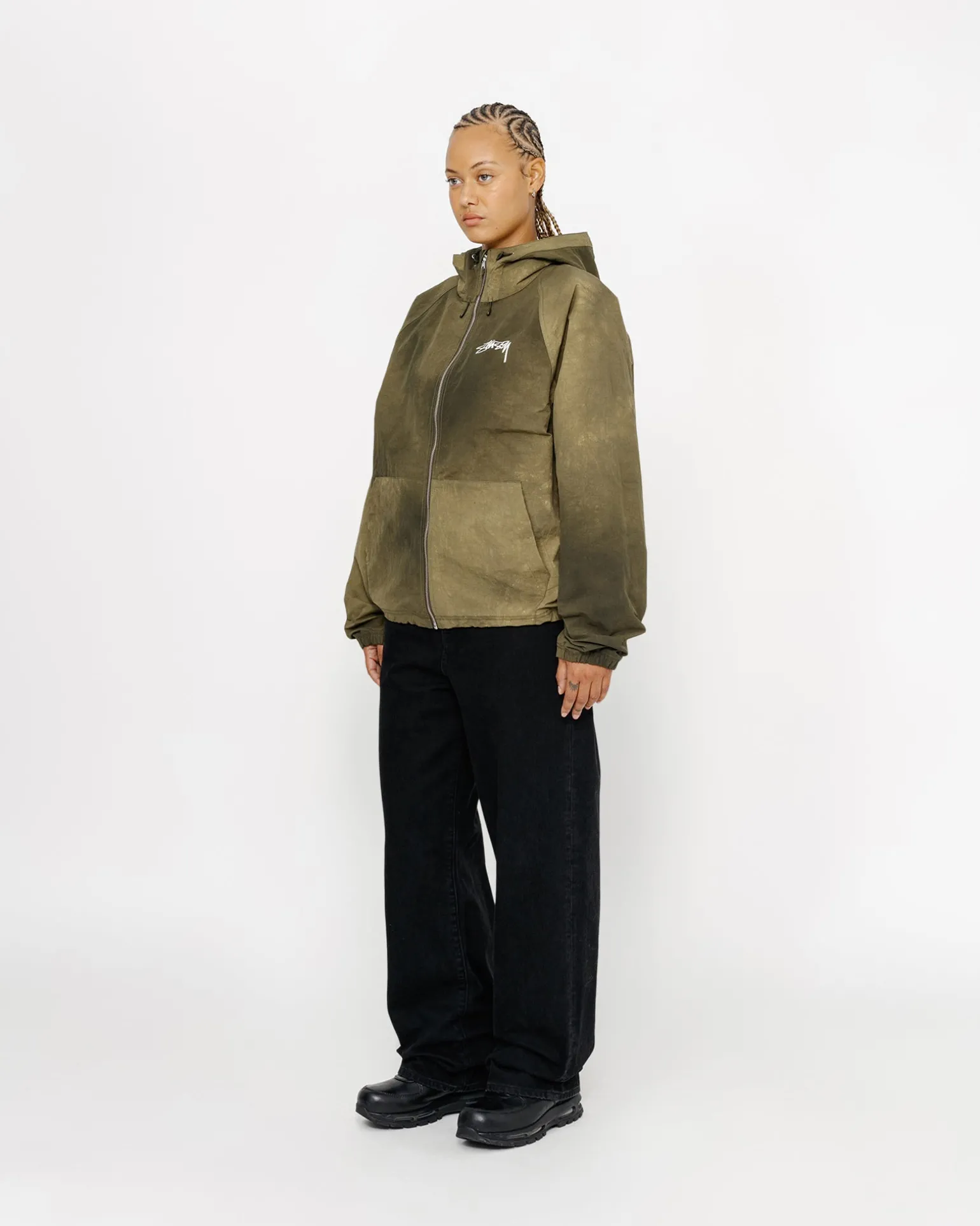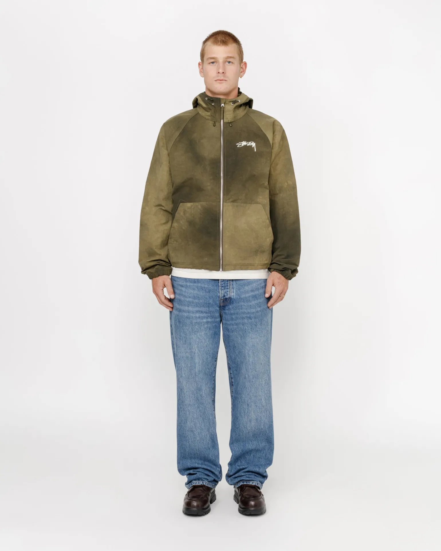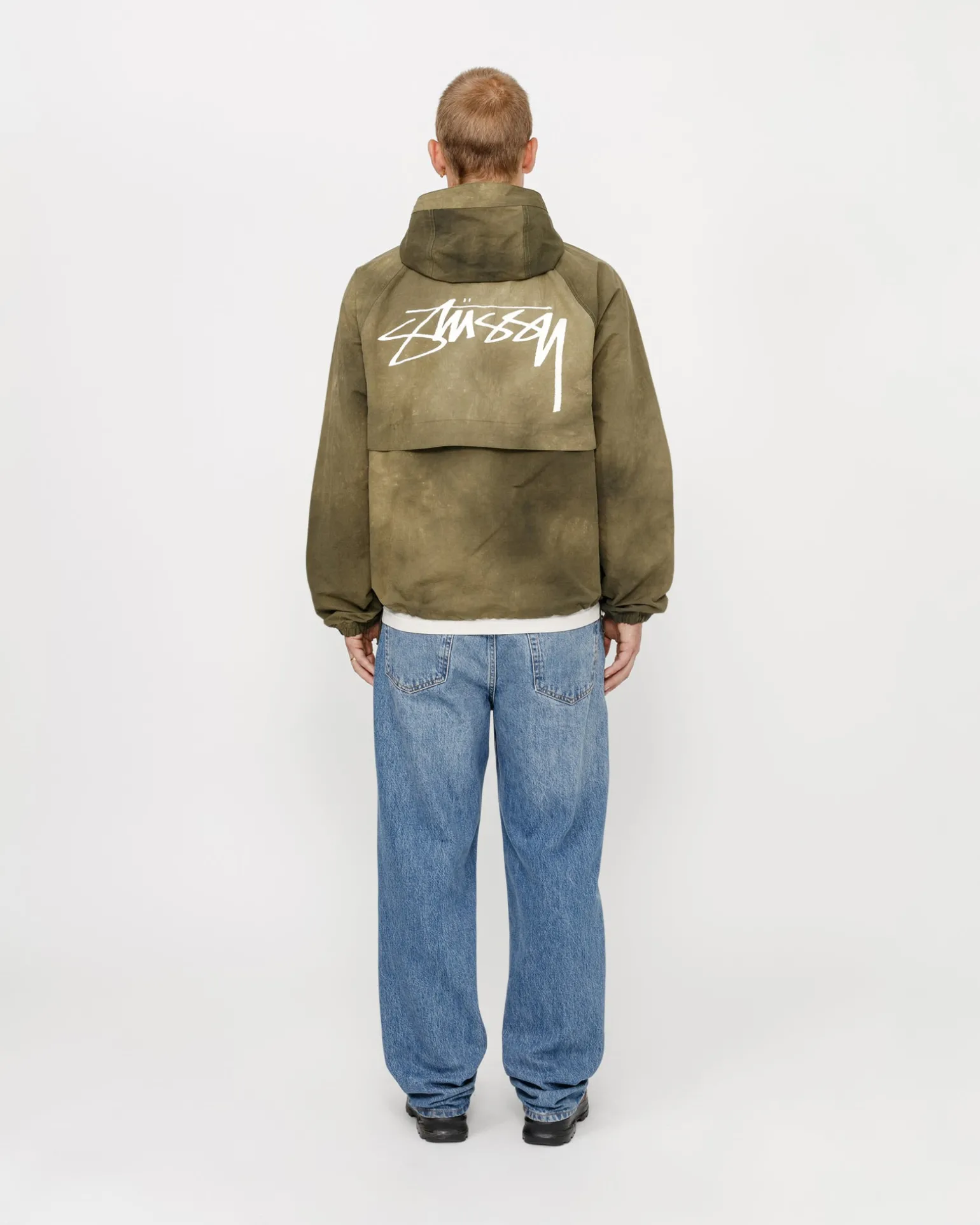 Weite Shell-Jacke aus strukturiertem Wave-Dyed-Nylon. Mit Reißverschluss an der Vorderseite und verstellbaren Kordelzügen an Kapuze und Saum. Gedrucktes Stüssy Smooth Stock Logo auf der linken Brust und auf dem Rücken.