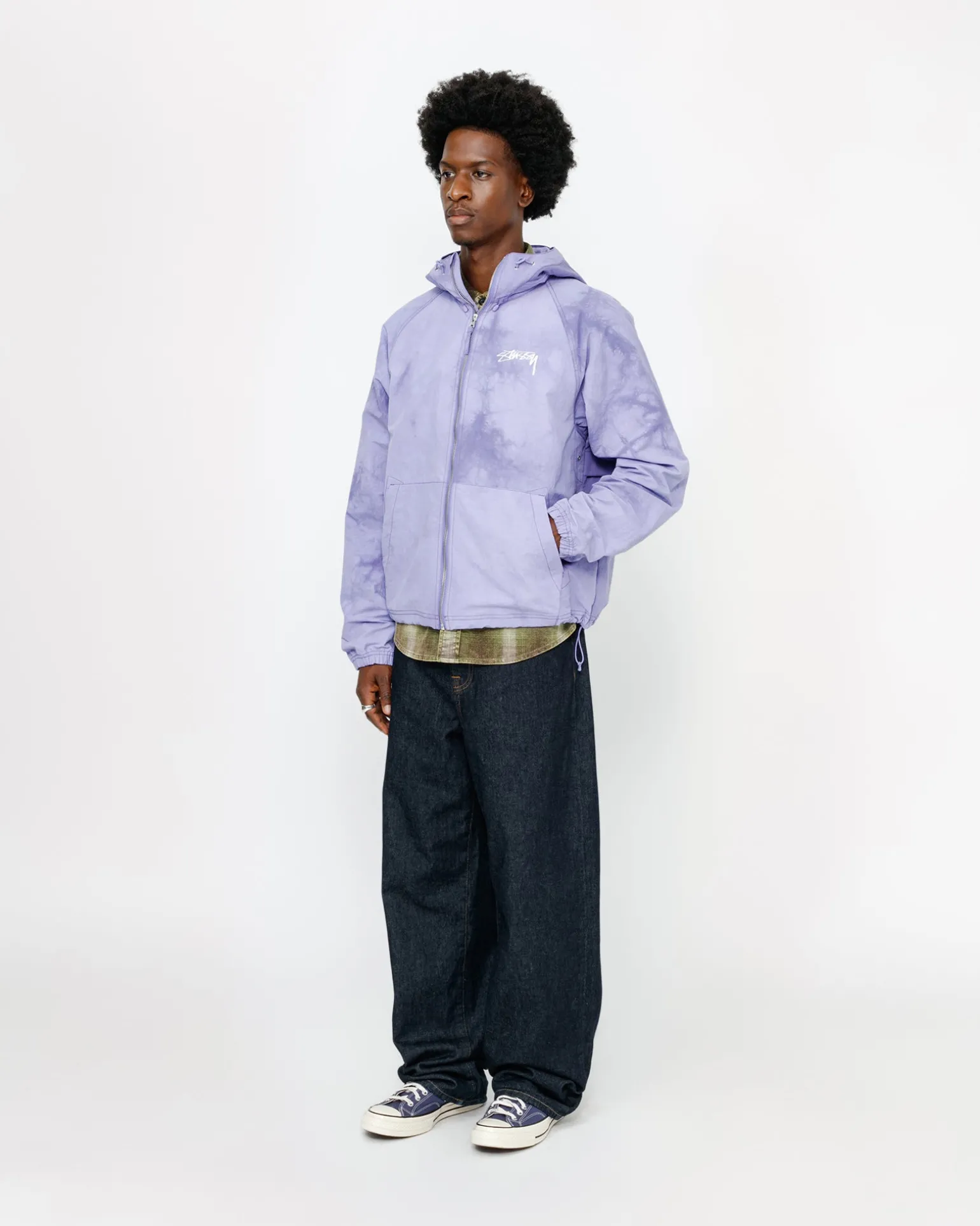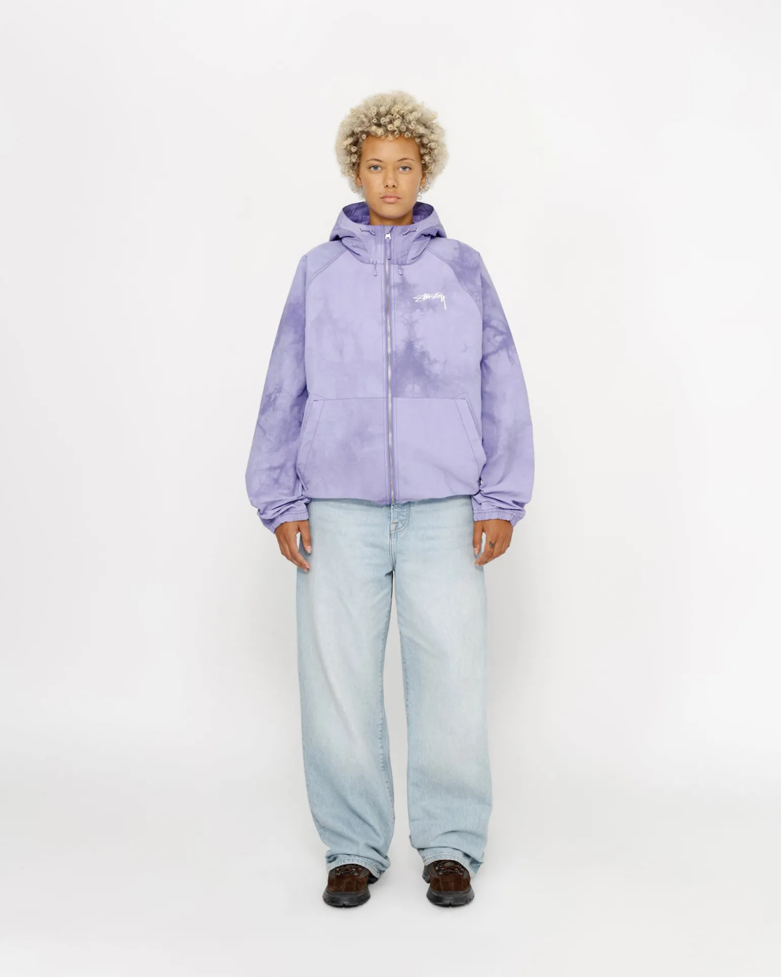 Weite Shell-Jacke aus strukturiertem Wave-Dyed-Nylon. Mit Reißverschluss an der Vorderseite und verstellbaren Kordelzügen an Kapuze und Saum. Gedrucktes Stüssy Smooth Stock Logo auf der linken Brust und auf dem Rücken.