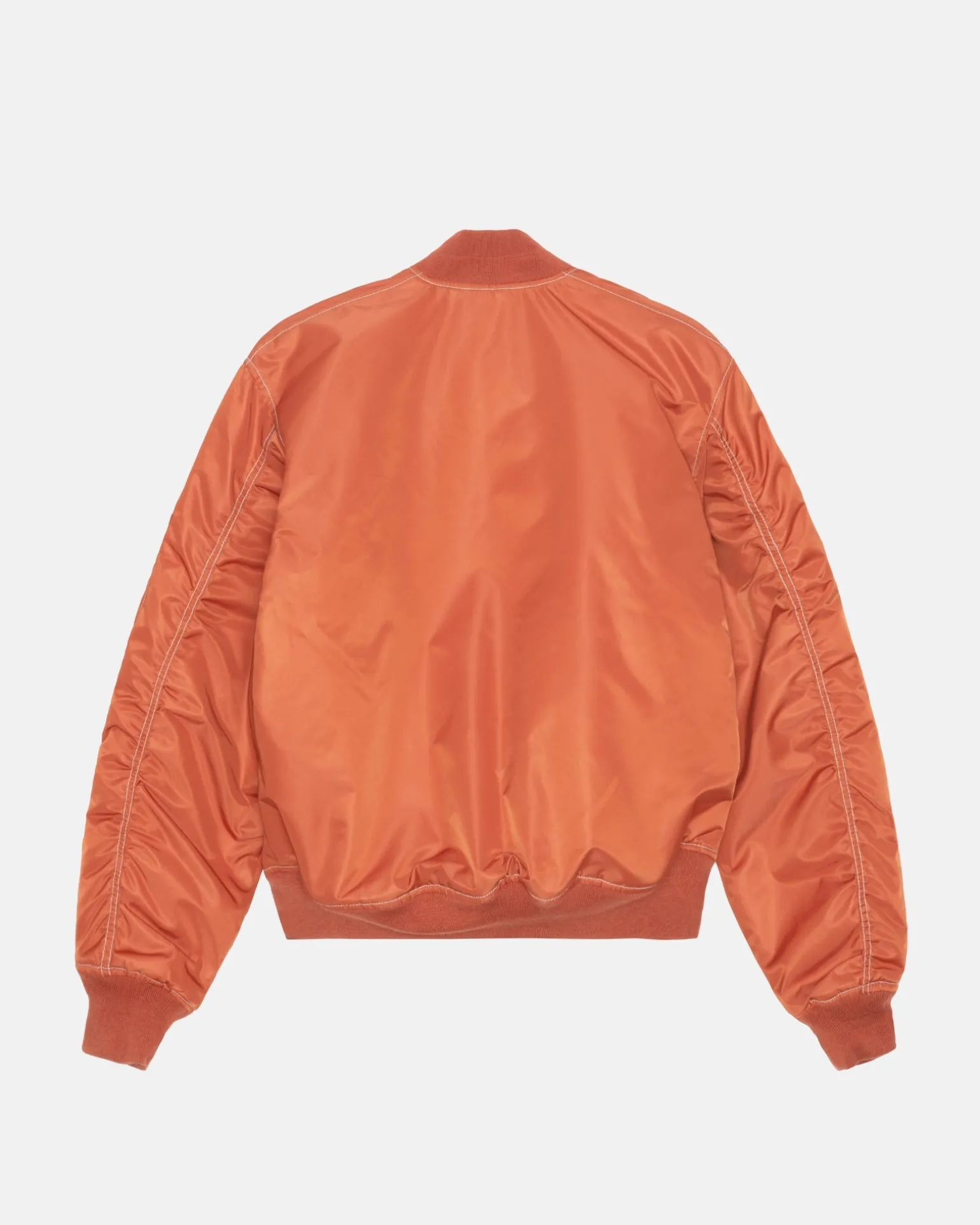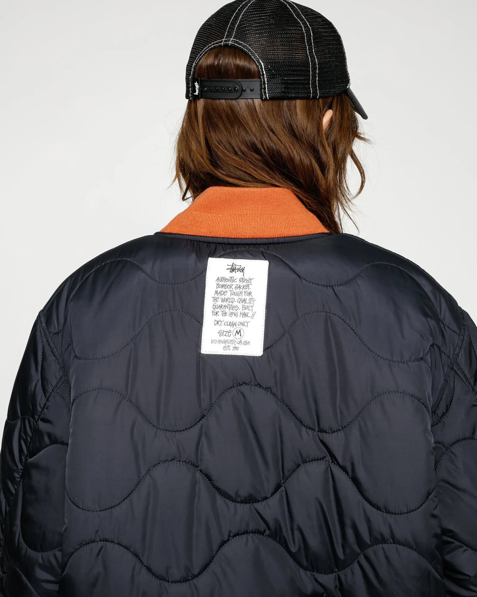 Reversible bomber jacket in durable water-repellent nylon with a quilted lining. Relaxed fit featuring a sleeve pocket, exterior flap pockets and interior welt pockets. Embroidery at the lower front.