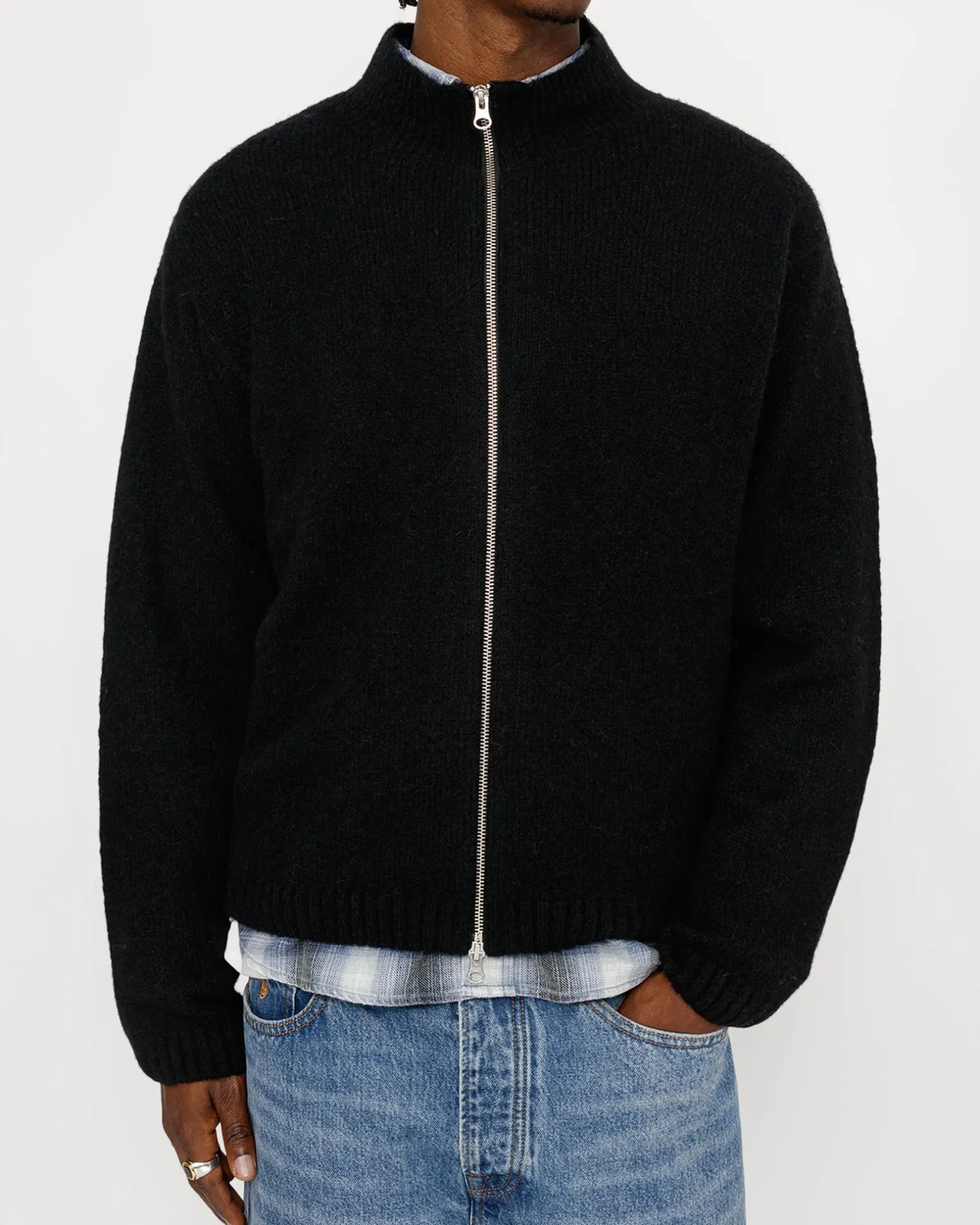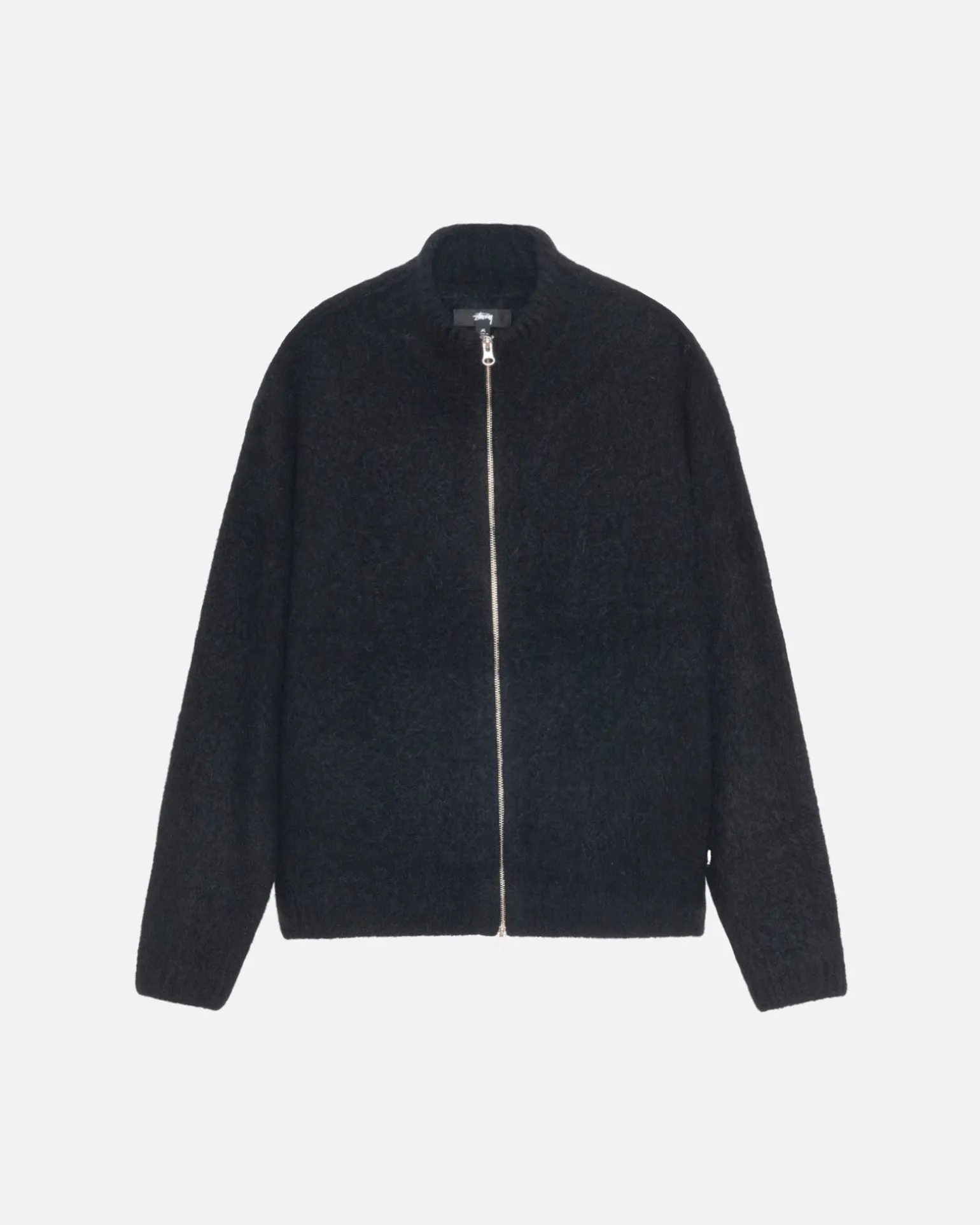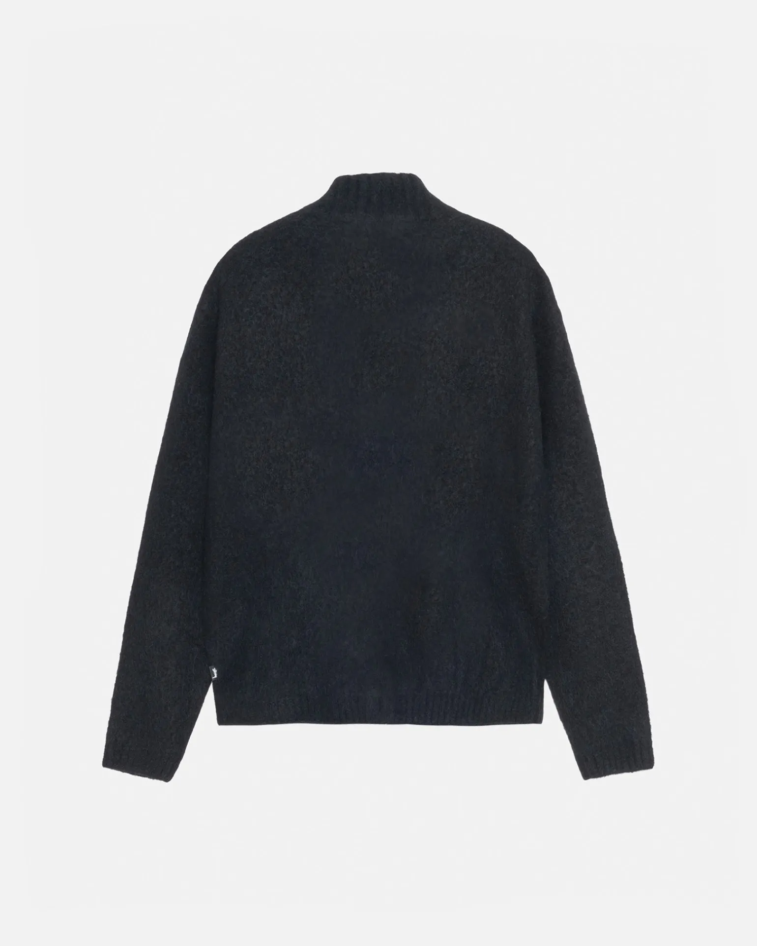 Klassisch geschnittener Pullover aus einer gebürsteten Yak- und Alpaka-Mischung Mit Stehkragen und Reißverschluss. Stüssy Stock Label an der Seitennaht aufgenäht.