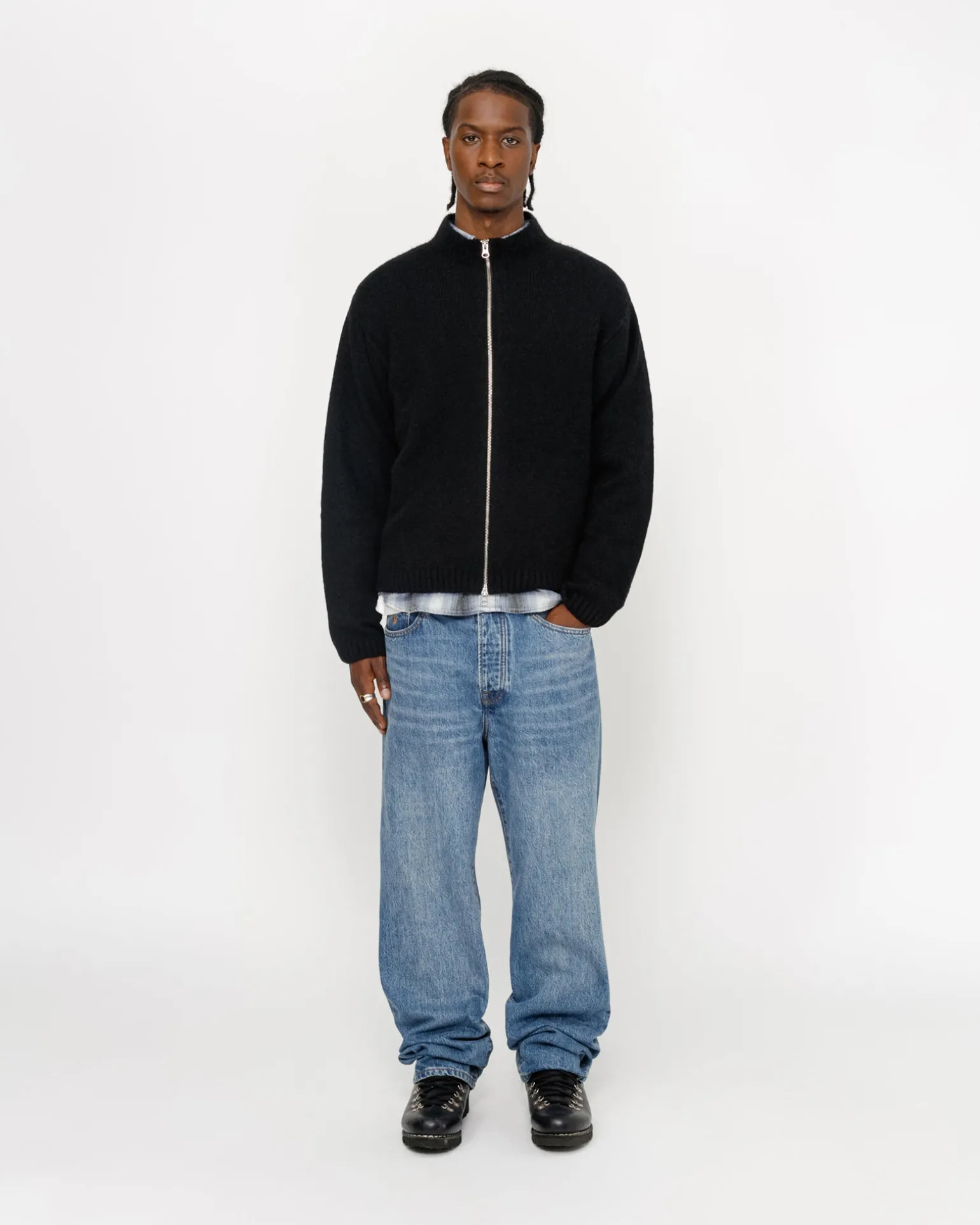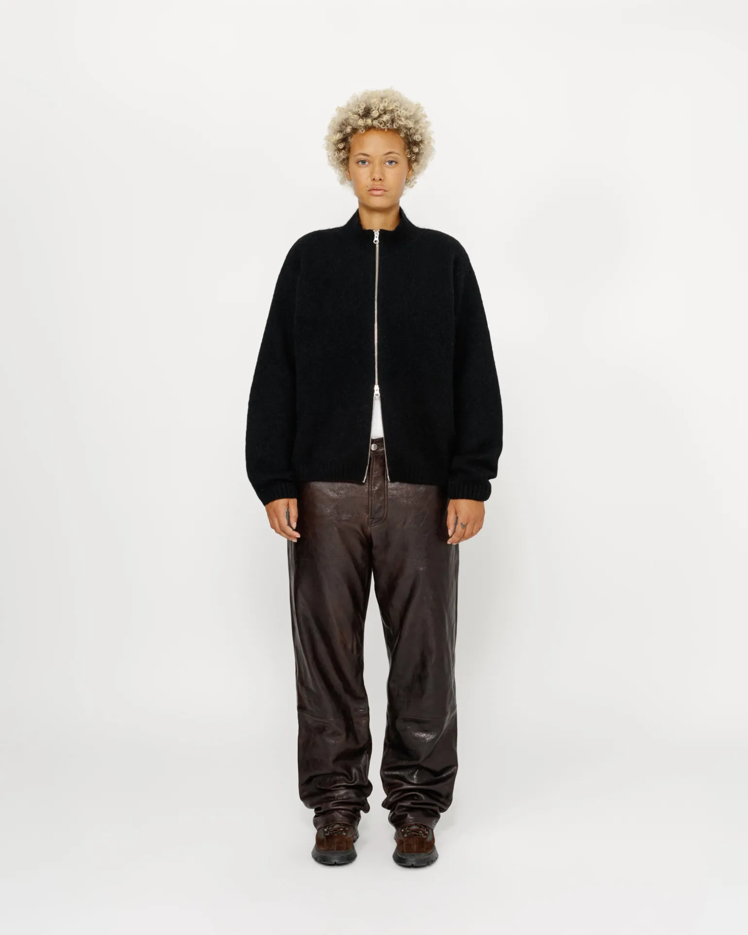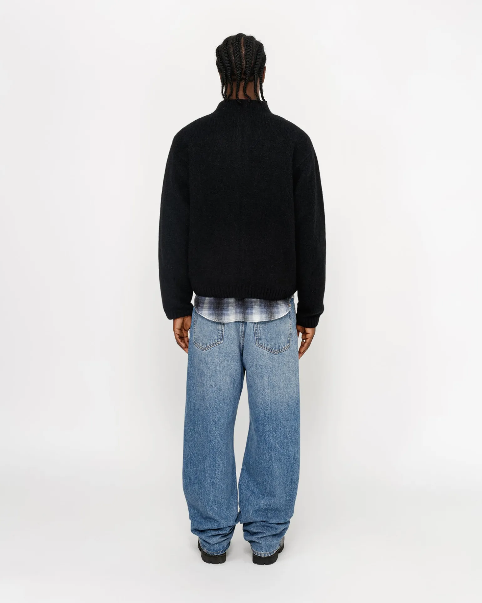 Klassisch geschnittener Pullover aus einer gebürsteten Yak- und Alpaka-Mischung Mit Stehkragen und Reißverschluss. Stüssy Stock Label an der Seitennaht aufgenäht.