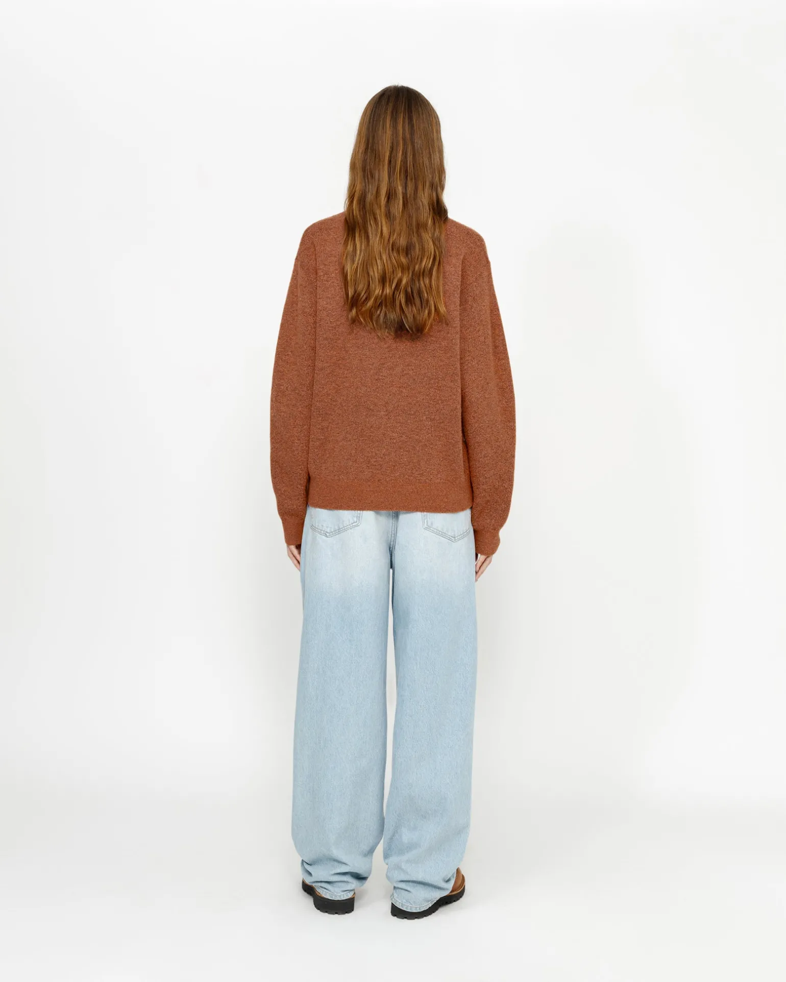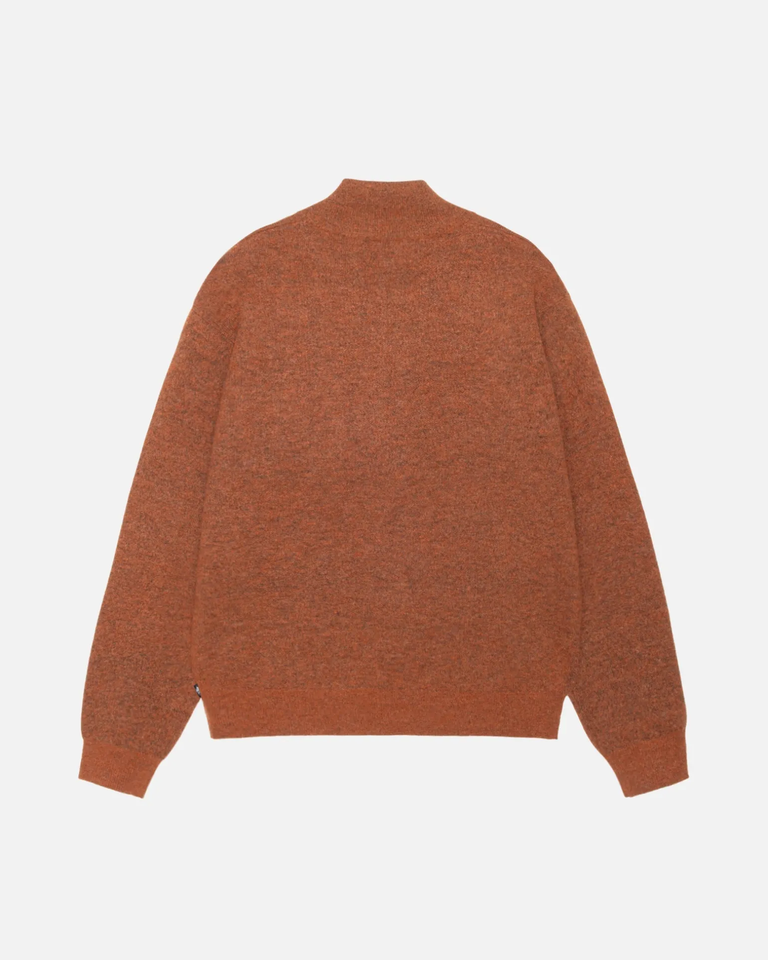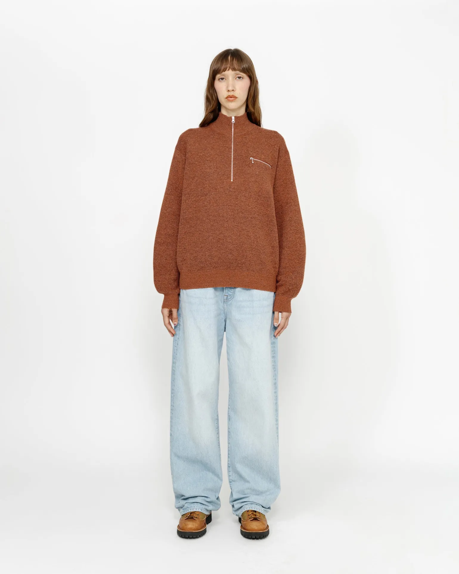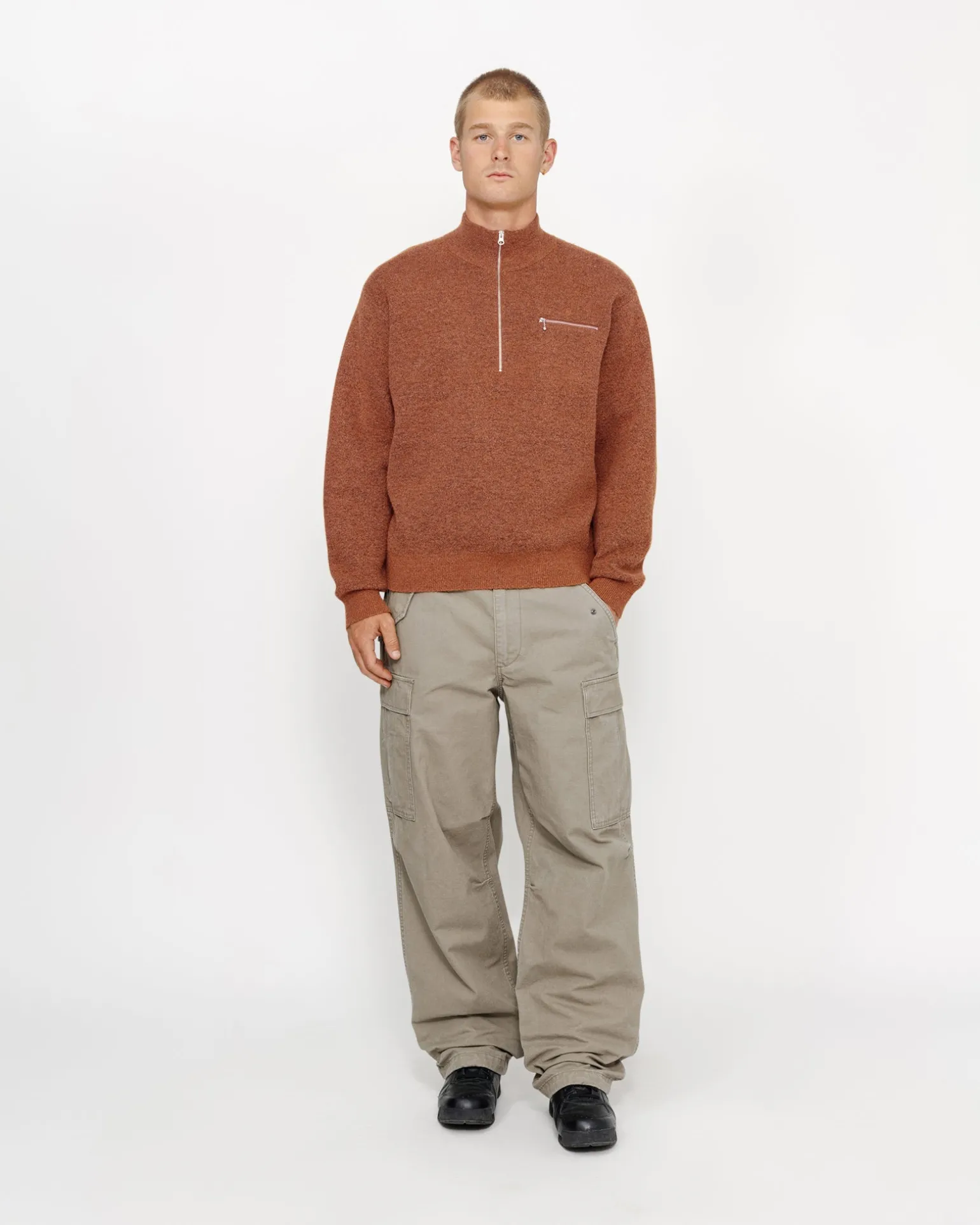 Klassisch geschnittener mittelschwerer Pullover. Mit Stehkragen, halbem Reißverschluss und einer Brusttasche. Geschwungenes Stüssy „S“ in farblich abgestimmter Stickerei auf der Vorderseite.