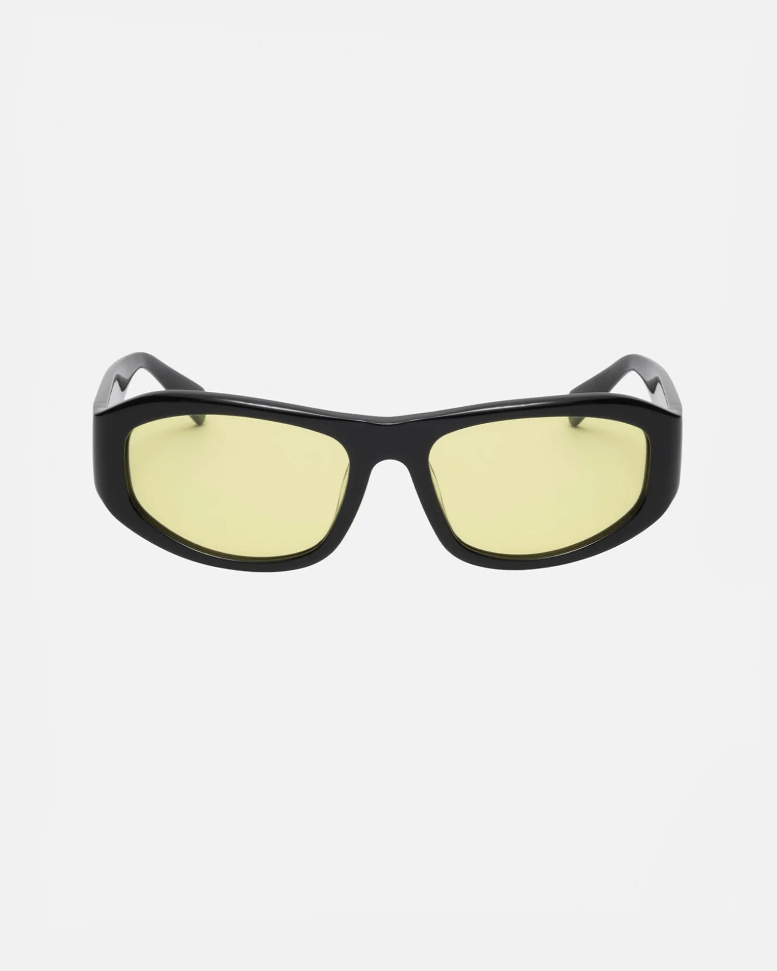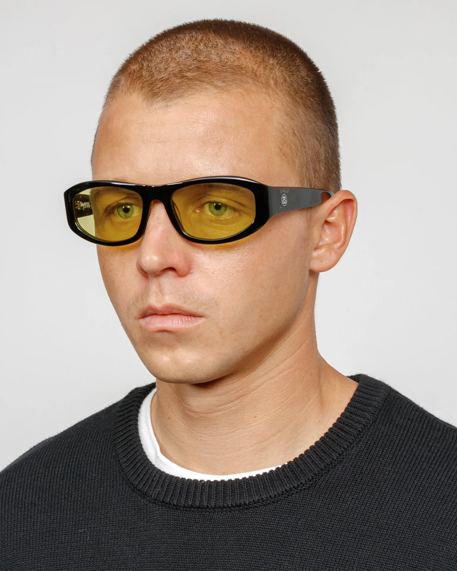 Sonnenbrille aus Acetat in Wrap-Around Form mit getönten Gläsern. Stüssy SS Link-Metallplättchen an den Bügeln und Eyegear Logo an der Innenseite.