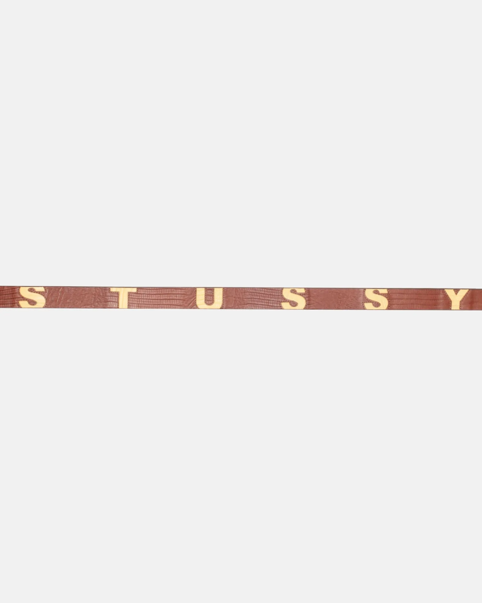 Ledergürtel mit einer Unterlage aus Kunst-Eidechsenhaut und einem geprägten Stüssy Stock-Logo auf der Schnalle