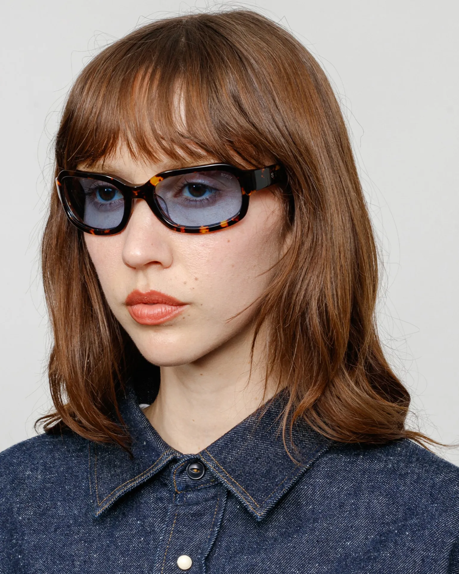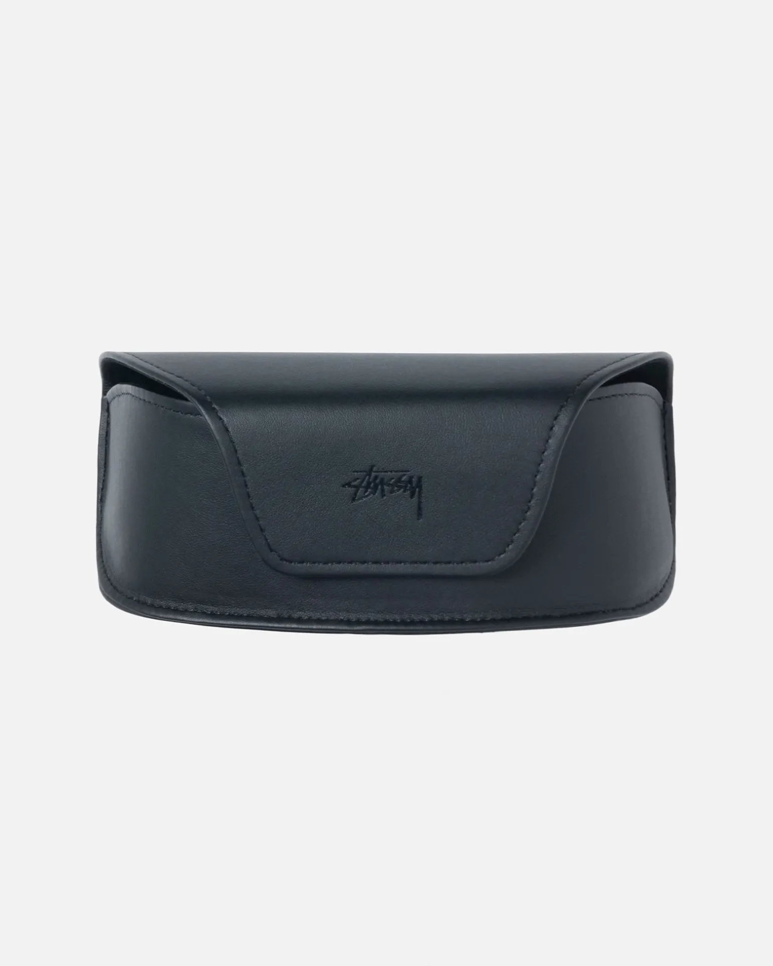 Sonnenbrille aus Acetat mit rechteckigem Gestell und getönten Gläsern. Stüssy-Branding an den Außenbügeln und Eyegear Logo an der Innenseite.