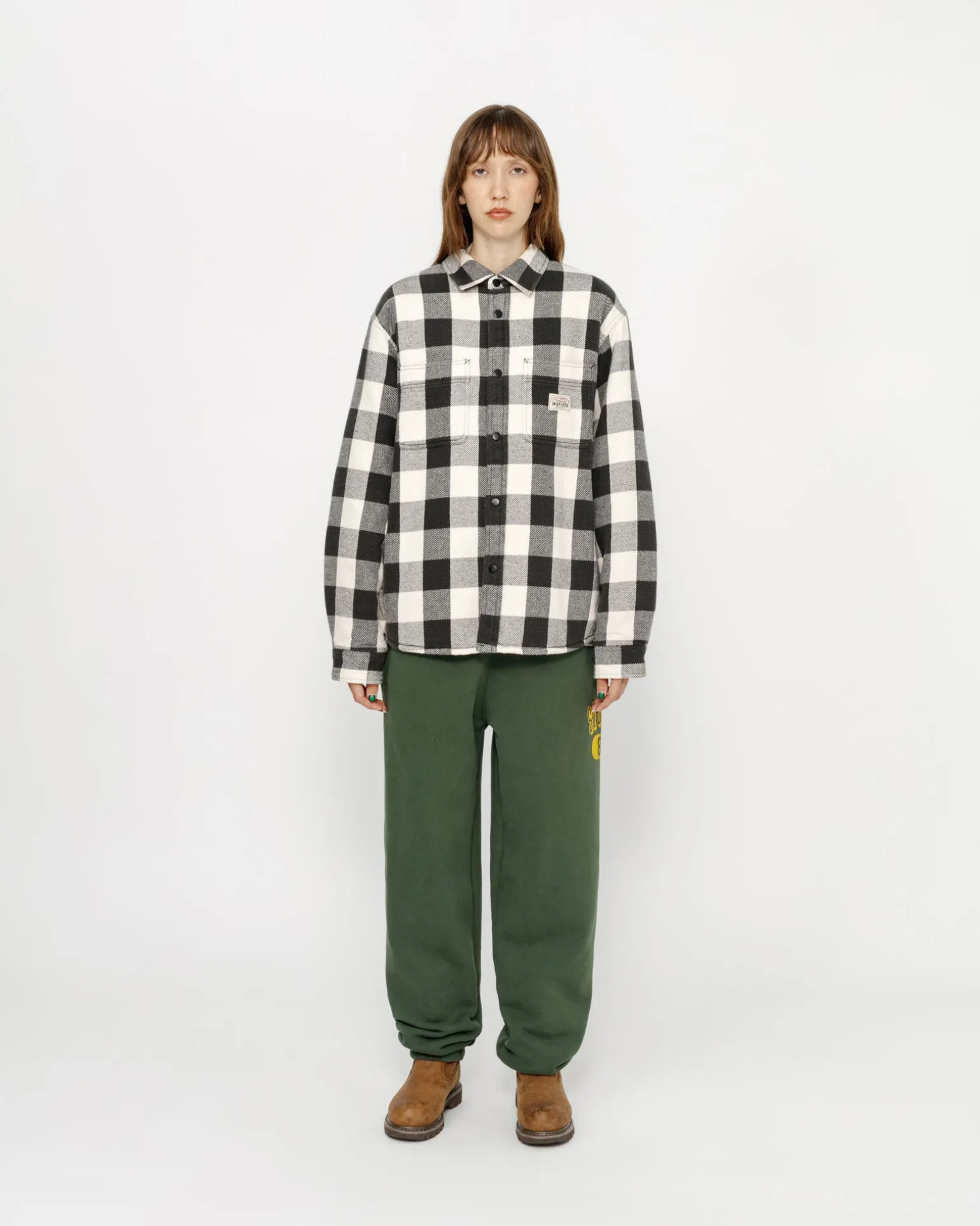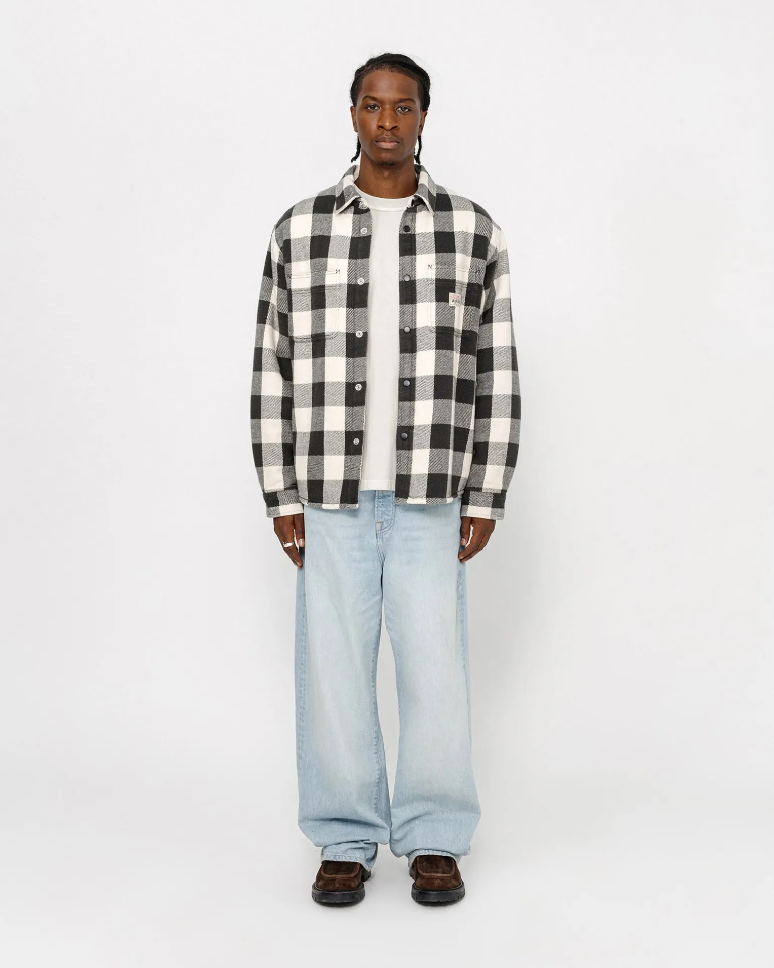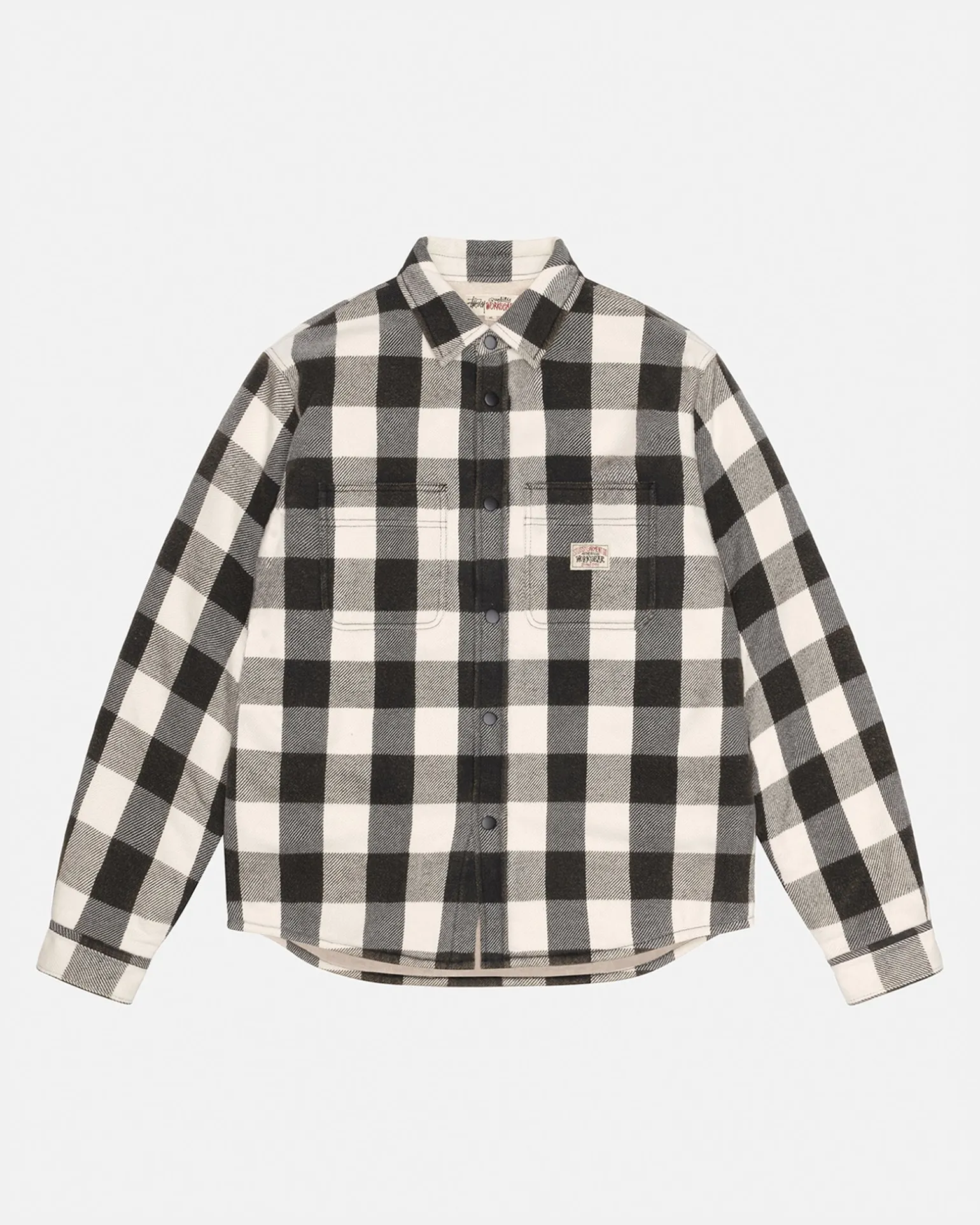 Weit geschnittenes Baumwollhemd mit Sherpa-Futter und Satinsteppungen in den Ärmeln. Mit aufgesetzten Taschen, Druckknopfverschluss vorne und Absteppungen entlang der Nähte. Aufgenähtes Stüssy Workgear Label auf der linken Tasche.
