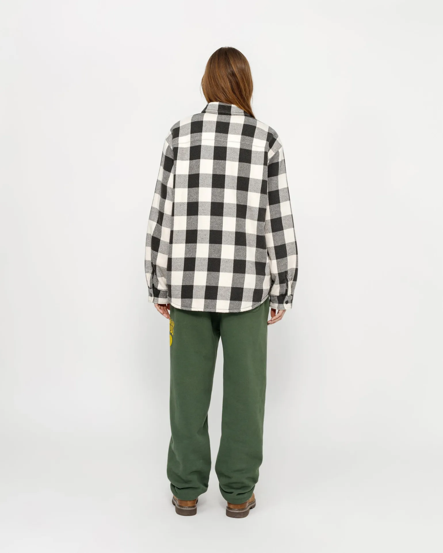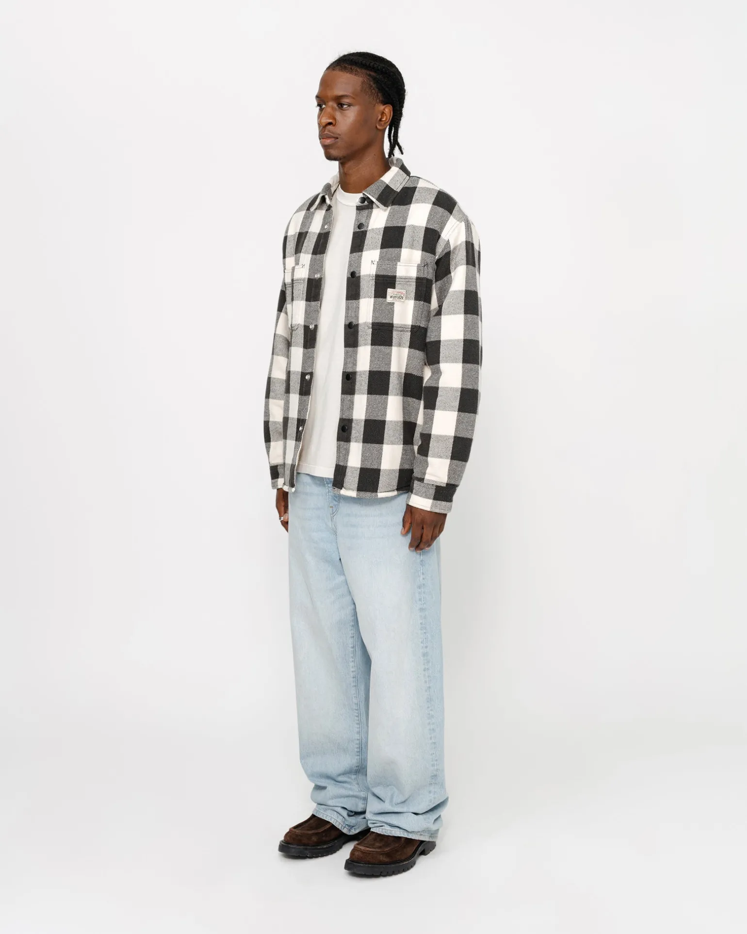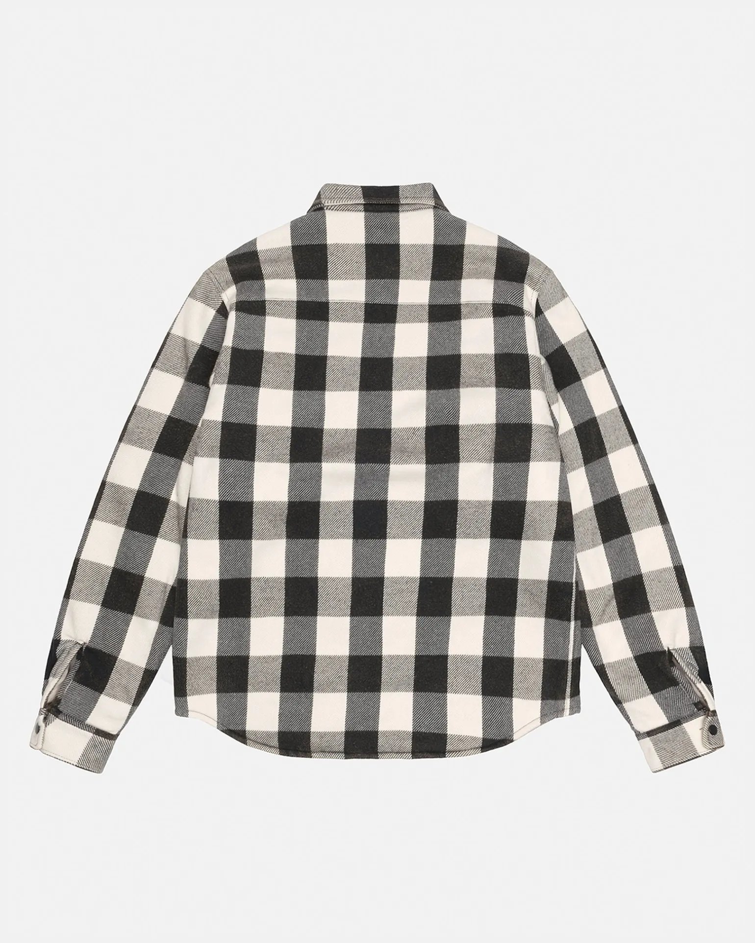 Weit geschnittenes Baumwollhemd mit Sherpa-Futter und Satinsteppungen in den Ärmeln. Mit aufgesetzten Taschen, Druckknopfverschluss vorne und Absteppungen entlang der Nähte. Aufgenähtes Stüssy Workgear Label auf der linken Tasche.