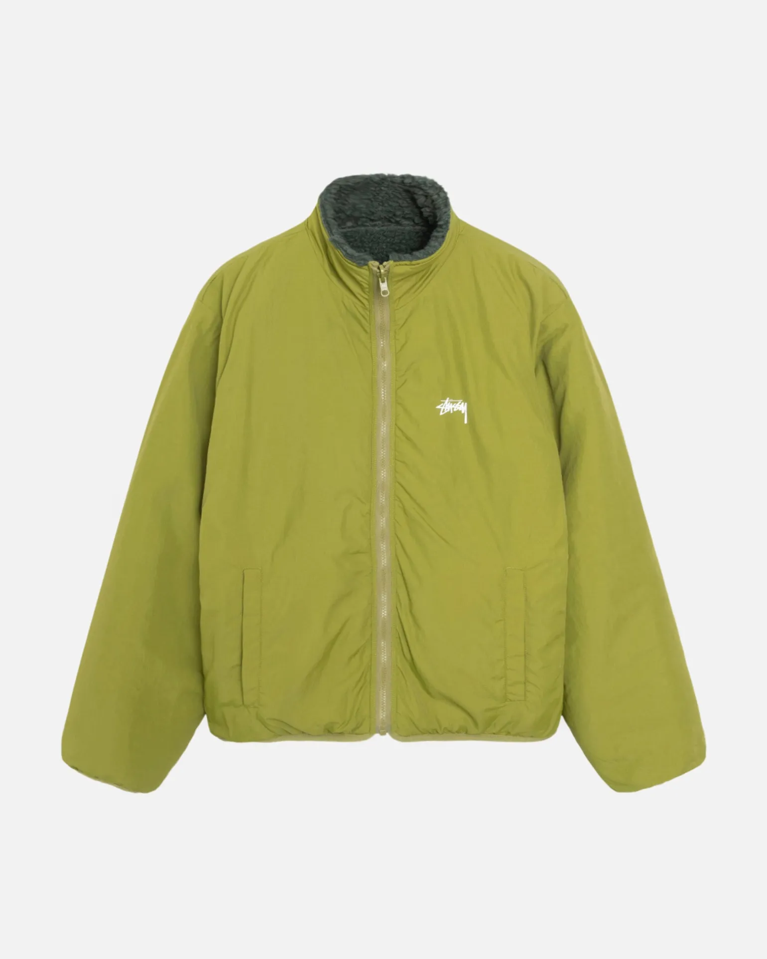 Klassisch geschnittene Wendejacke. Außenseite aus Sherpa-Fleece mit Reißverschluss, Nylontaschen und gesticktem Stüssy Stock Logo. Innenseite aus Nylon mit Leistentaschen und Stüssy Stock Logo auf der Brust.
