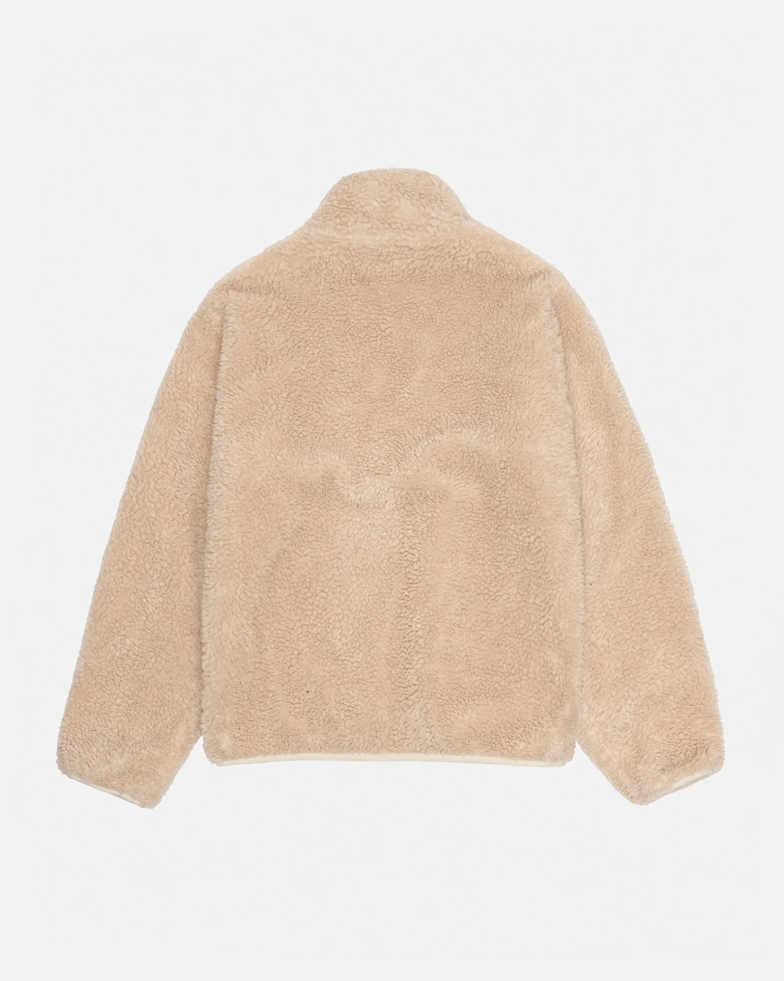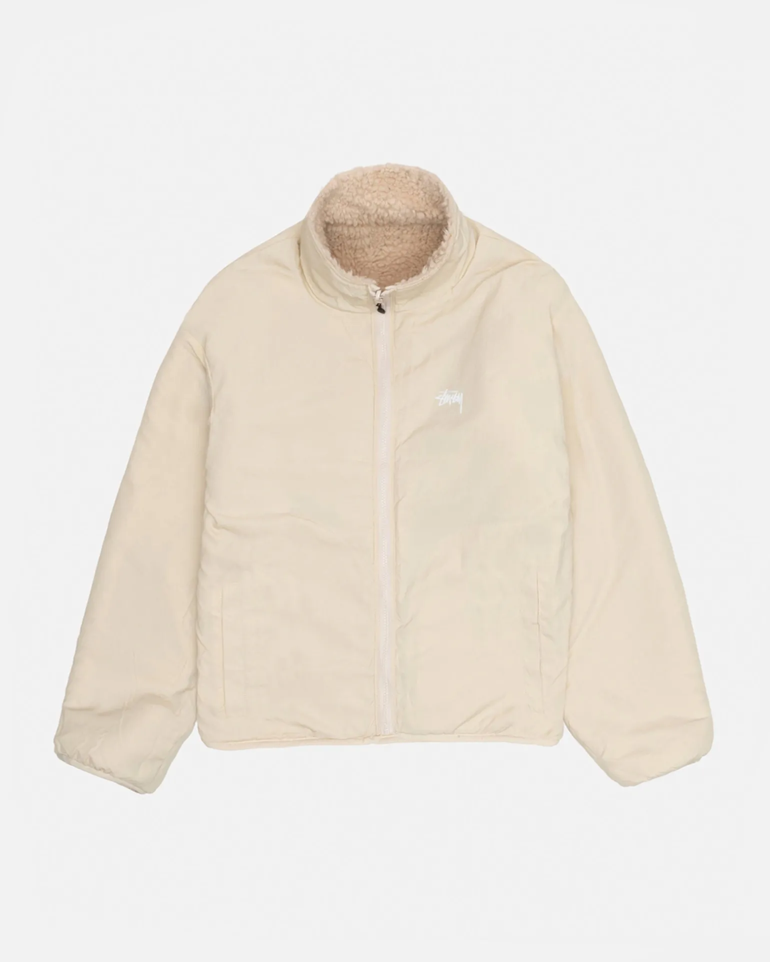 Klassisch geschnittene Wendejacke. Außenseite aus Sherpa-Fleece mit Reißverschluss, Nylontaschen und gesticktem Stüssy Stock Logo. Innenseite aus Nylon mit Leistentaschen und Stüssy Stock Logo auf der Brust.
