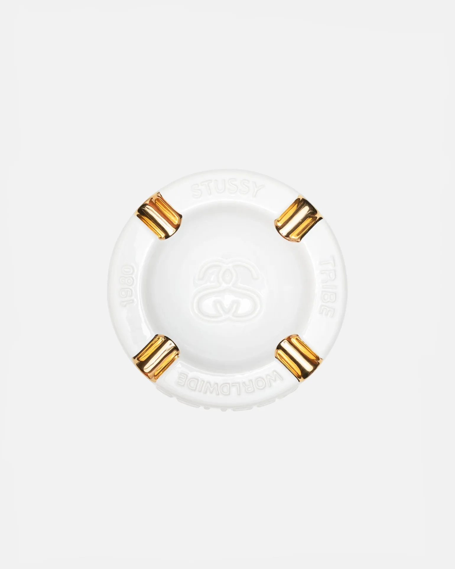 Aschenbecher aus Keramik mit geprägtem Stüssy-Branding und Goldfoliendetails.