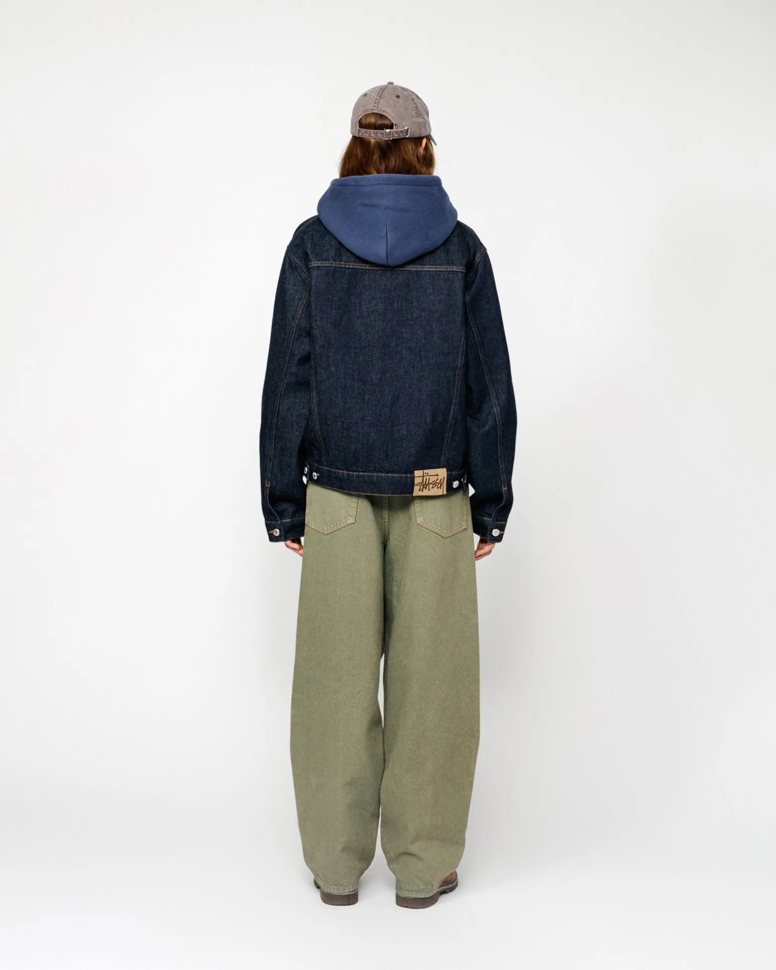 Trucker-Jacke aus 411 g Baumwoll-Denim mit lockerer, kastenförmiger Passform. Mit gebrandeten Nickelschäften und Aufnäher aus Wildleder mit Stüssy-Logo.