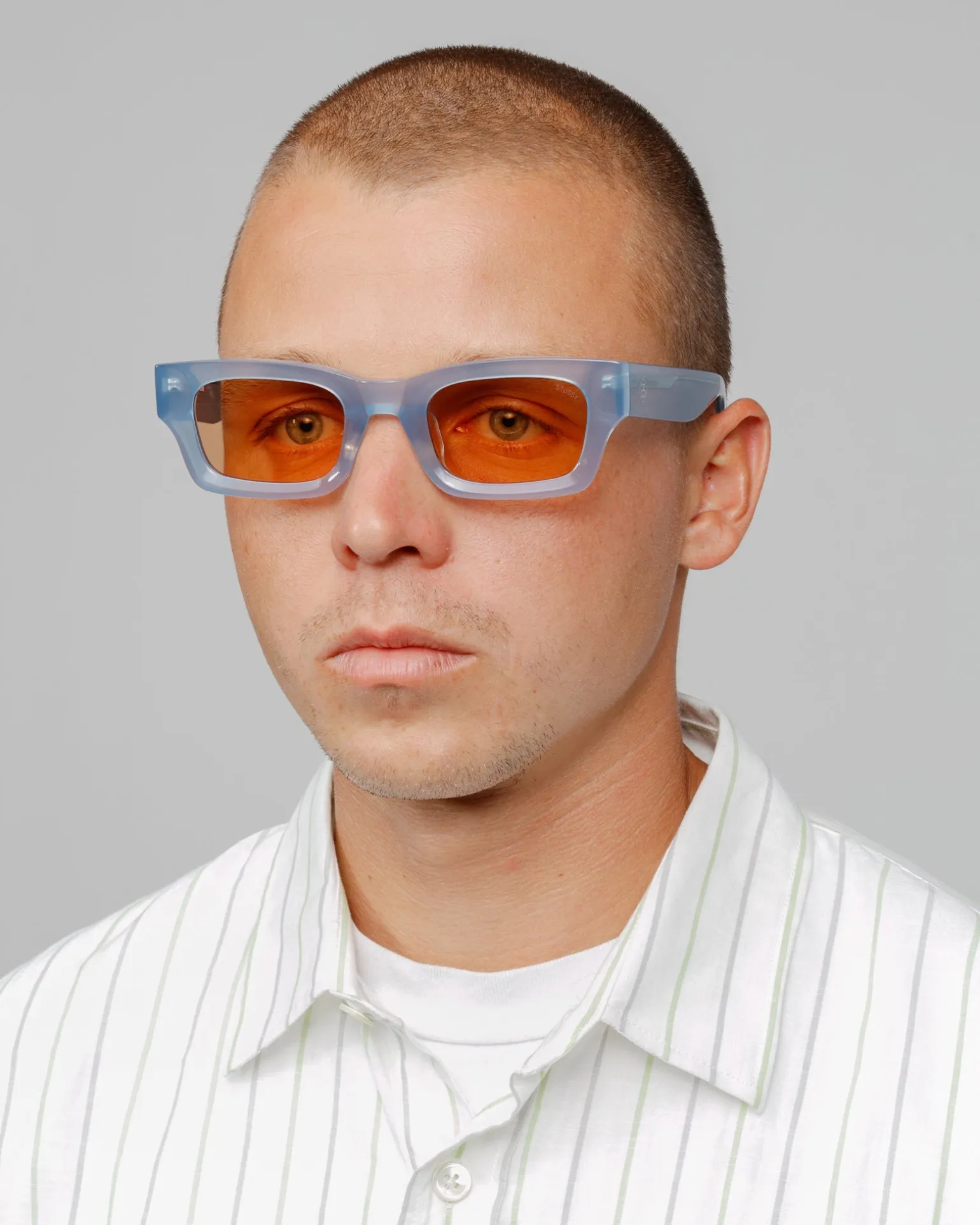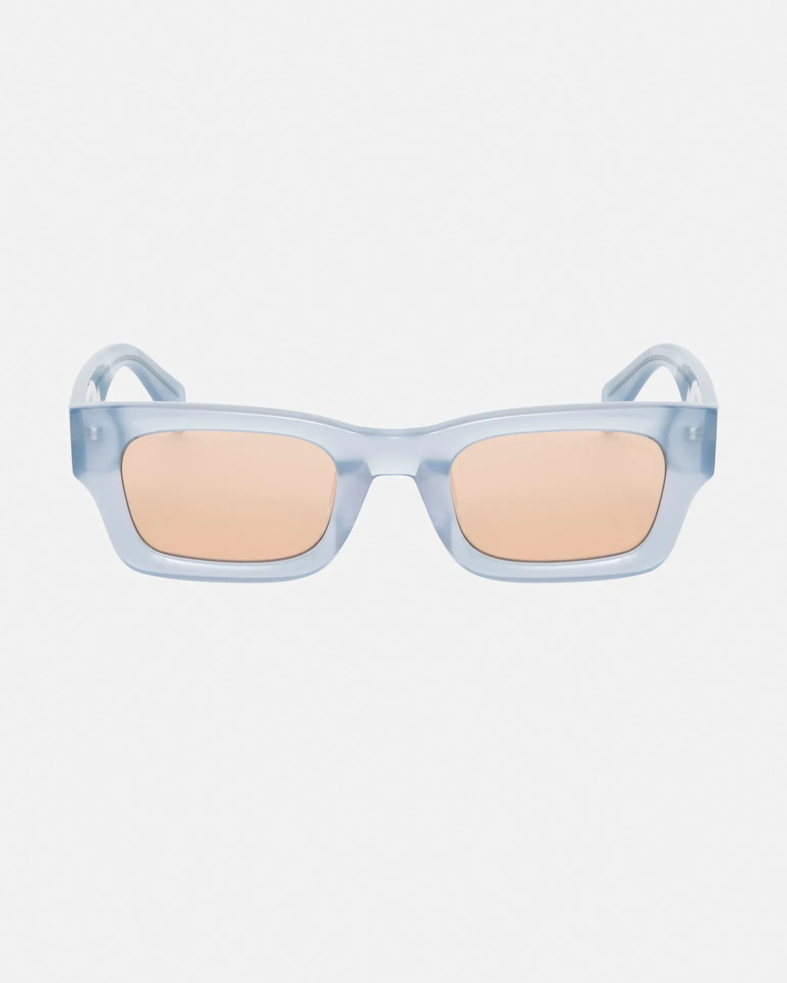 Sonnenbrille aus Acetat mit rechteckigem Gestell und getönten Gläsern. Stüssy SS Link Logo am Außenbügel und Eyegear Logo innen.
