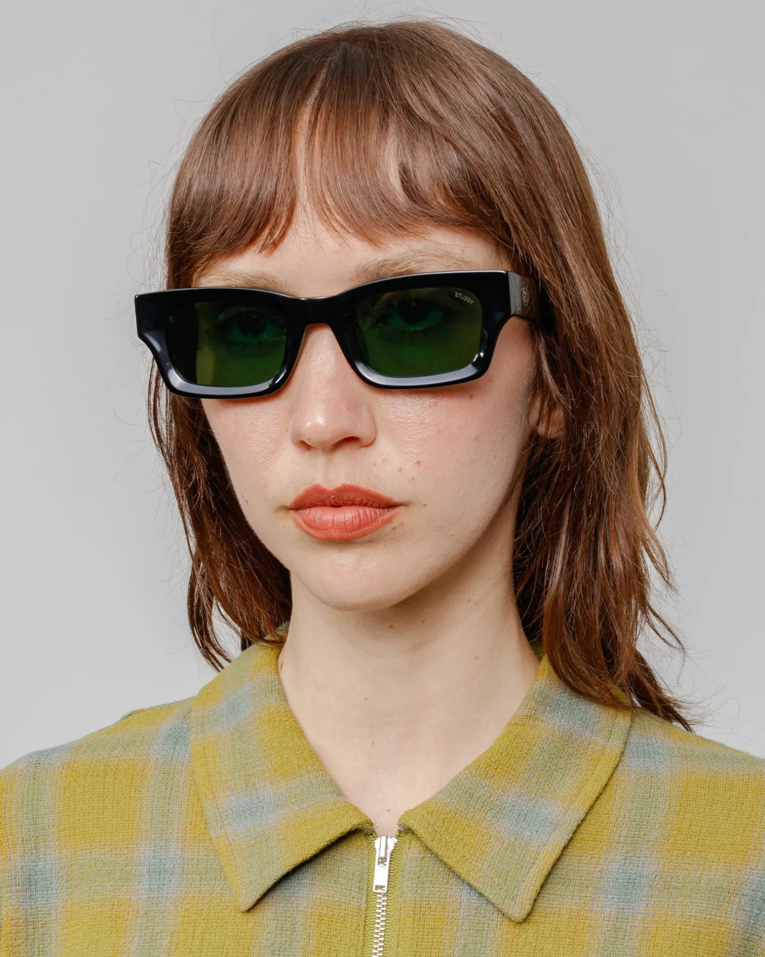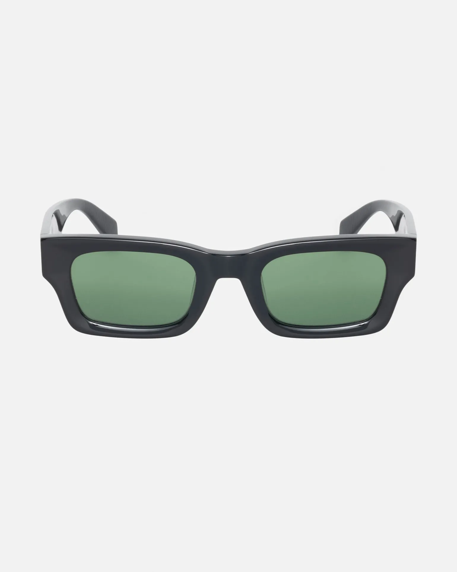 Sonnenbrille aus Acetat mit rechteckigem Gestell und getönten Gläsern. Stüssy SS Link Logo am Außenbügel und Eyegear Logo innen.