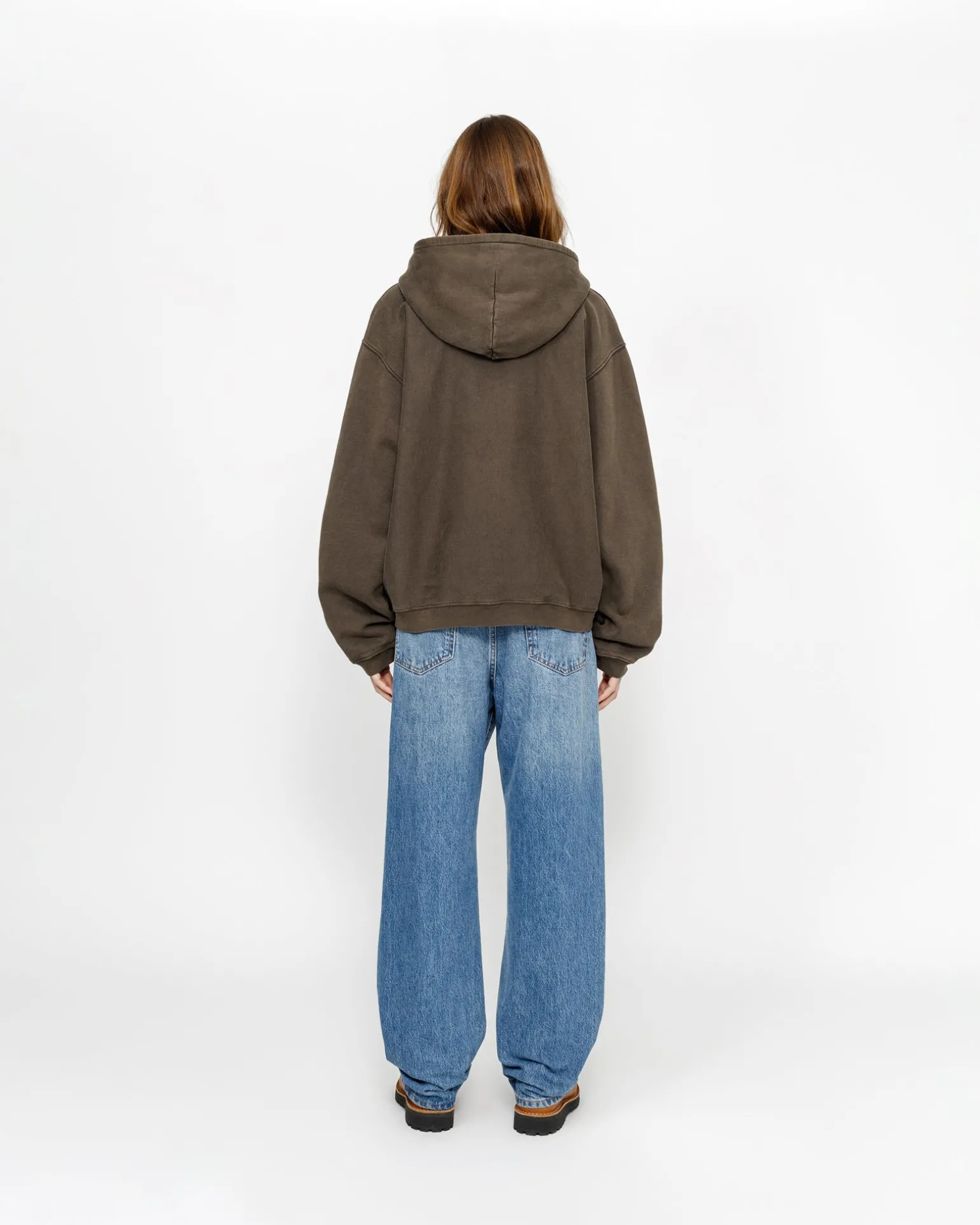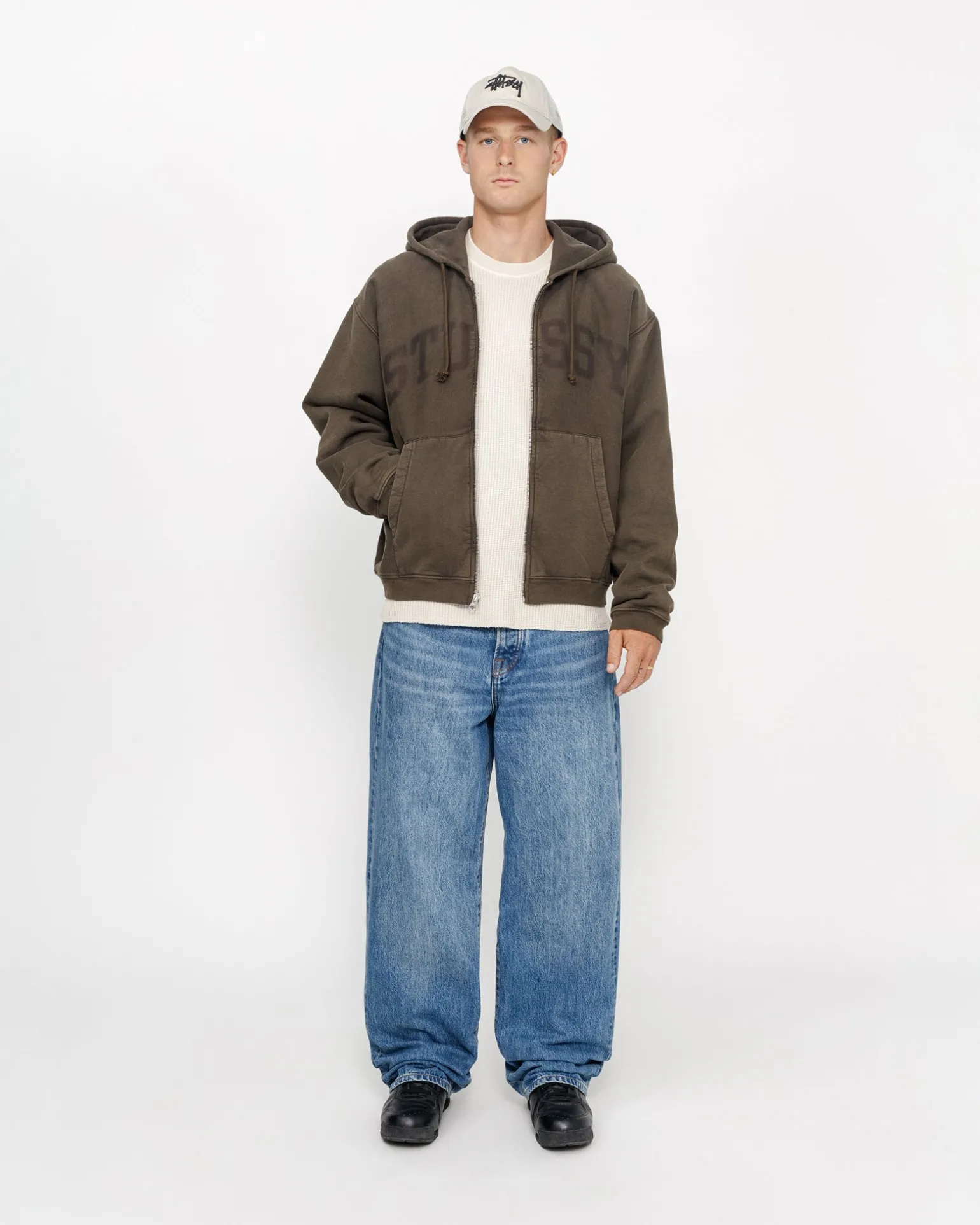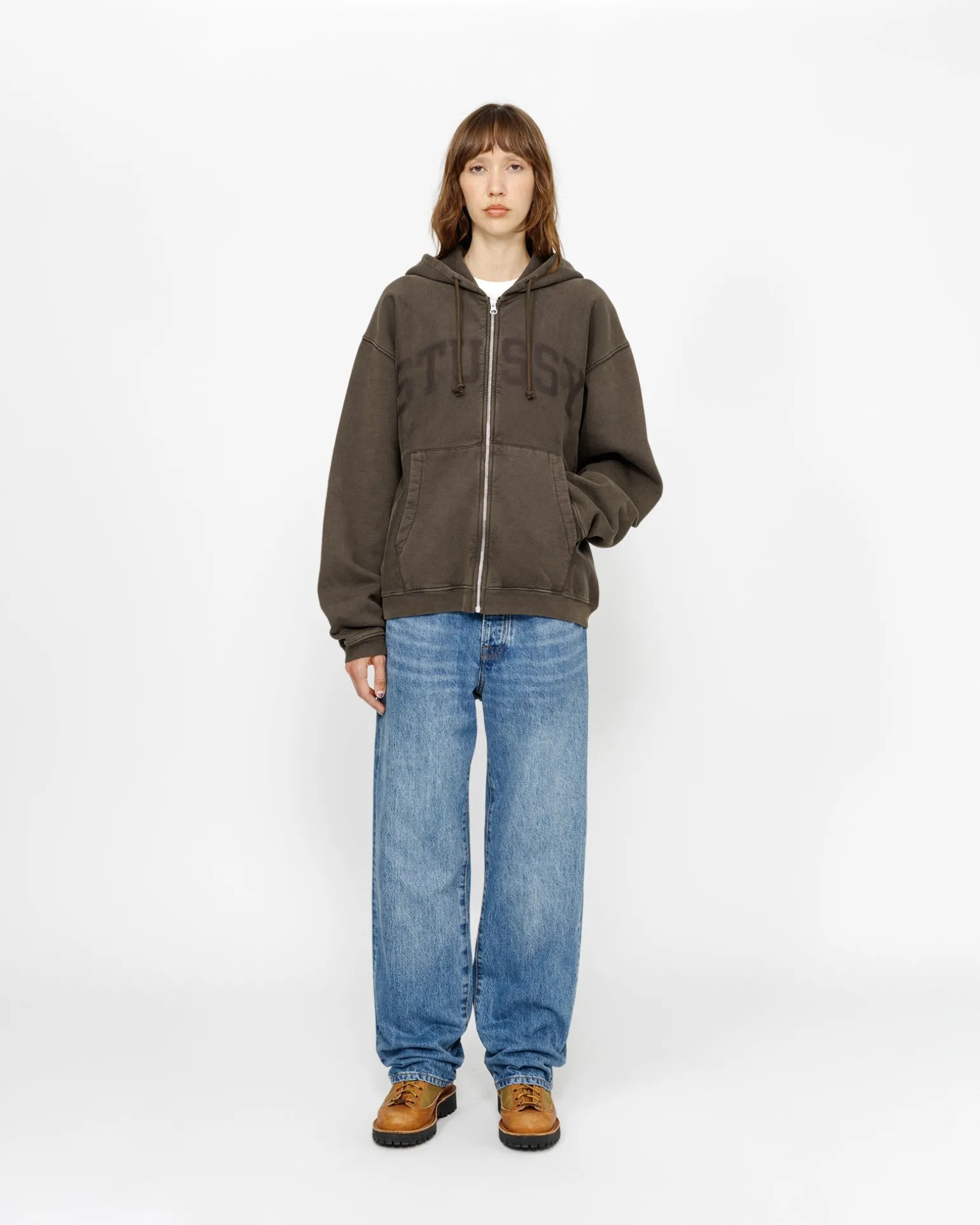 Kapuzensweatshirt mit Reißverschluss aus einer 448 g schweren Baumwollmischung mit verblasster Waschung Locker geschnitten mit Stüssy Arch Logo auf der Vorderseite.
