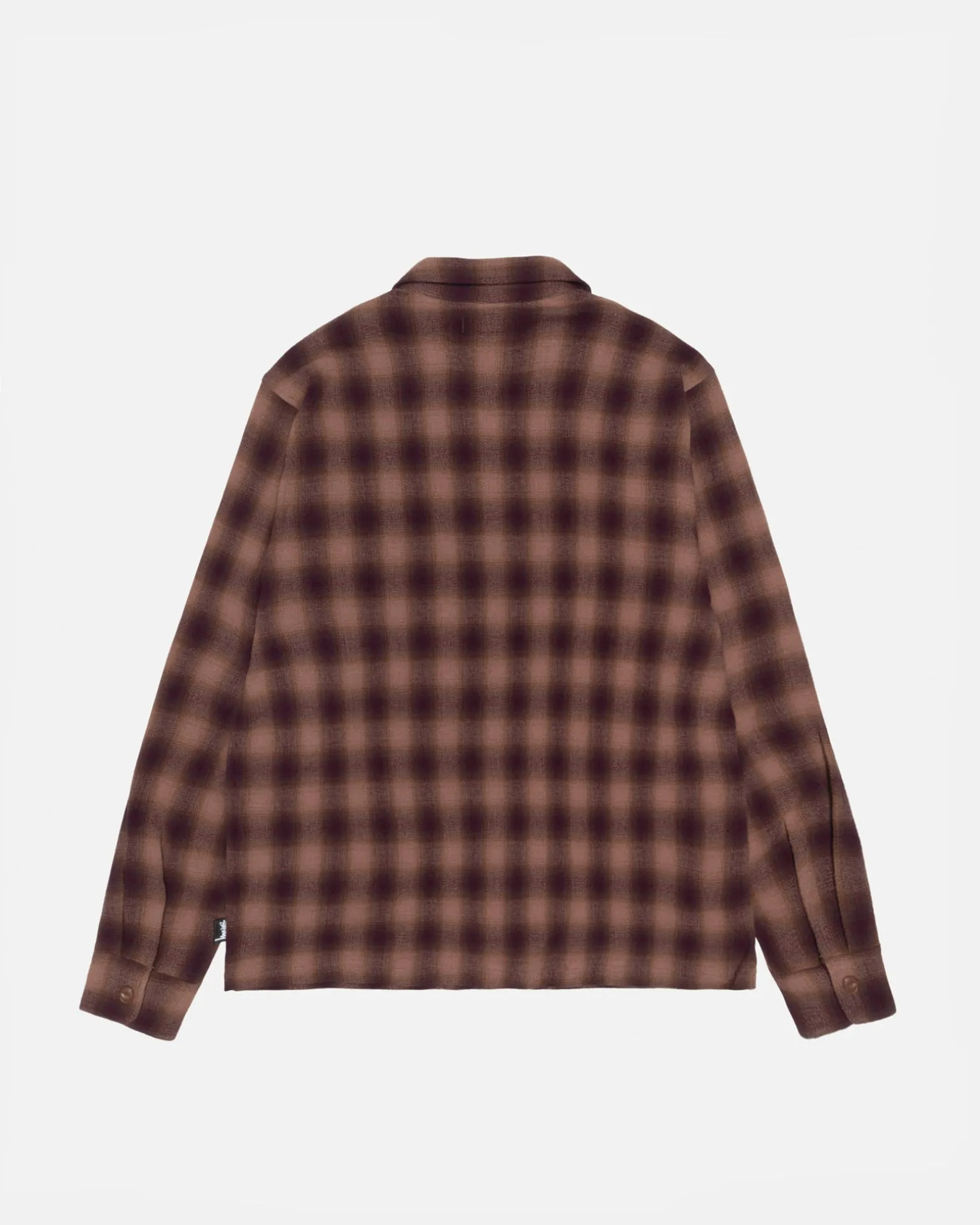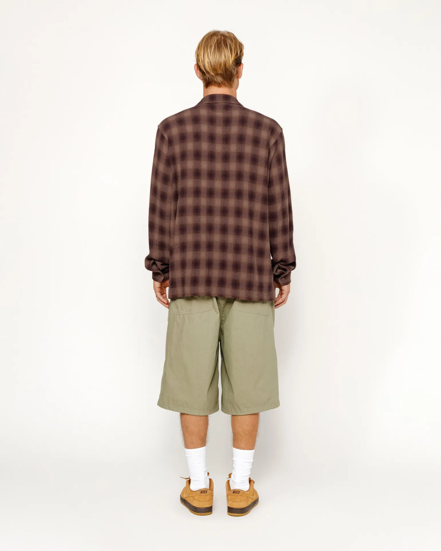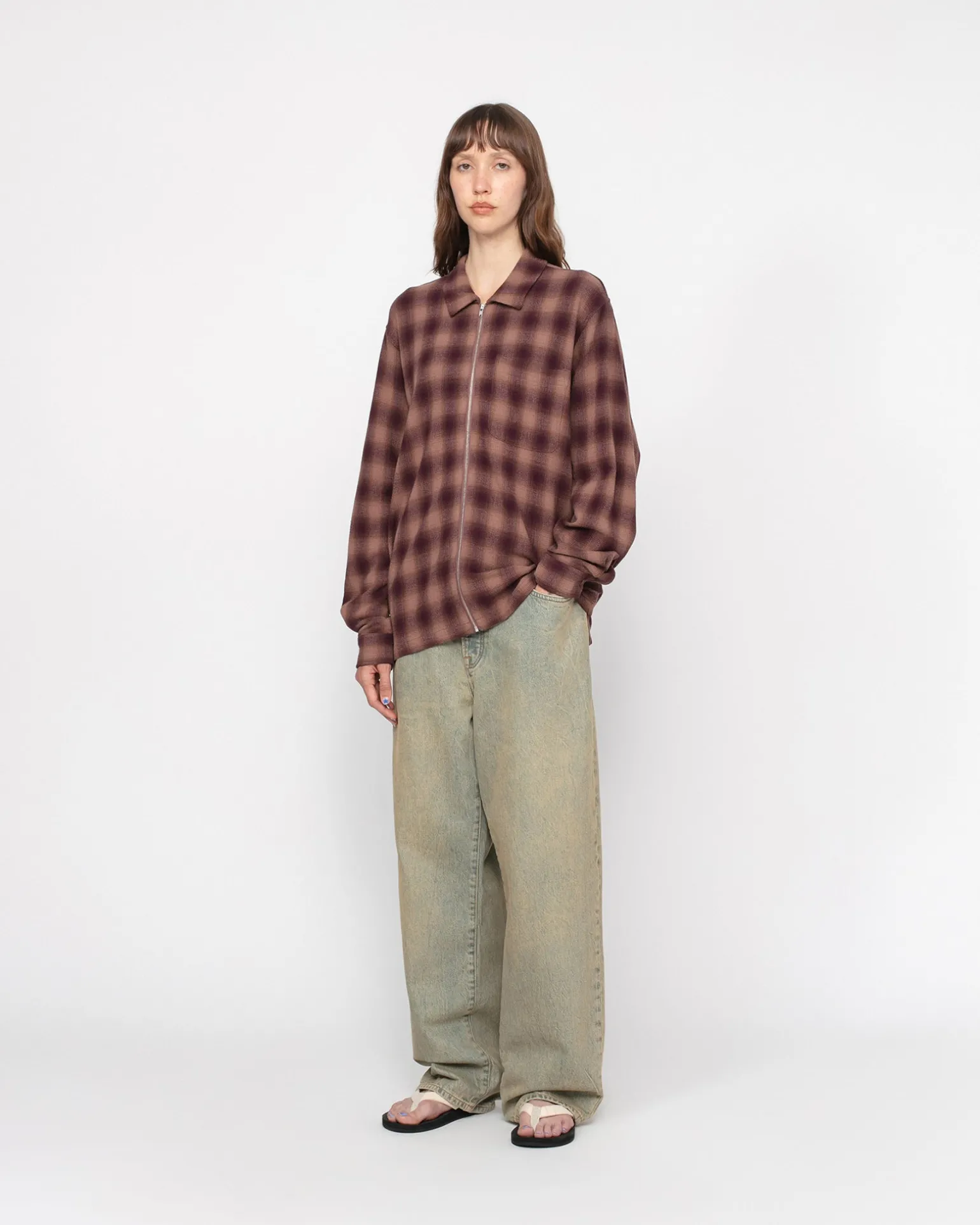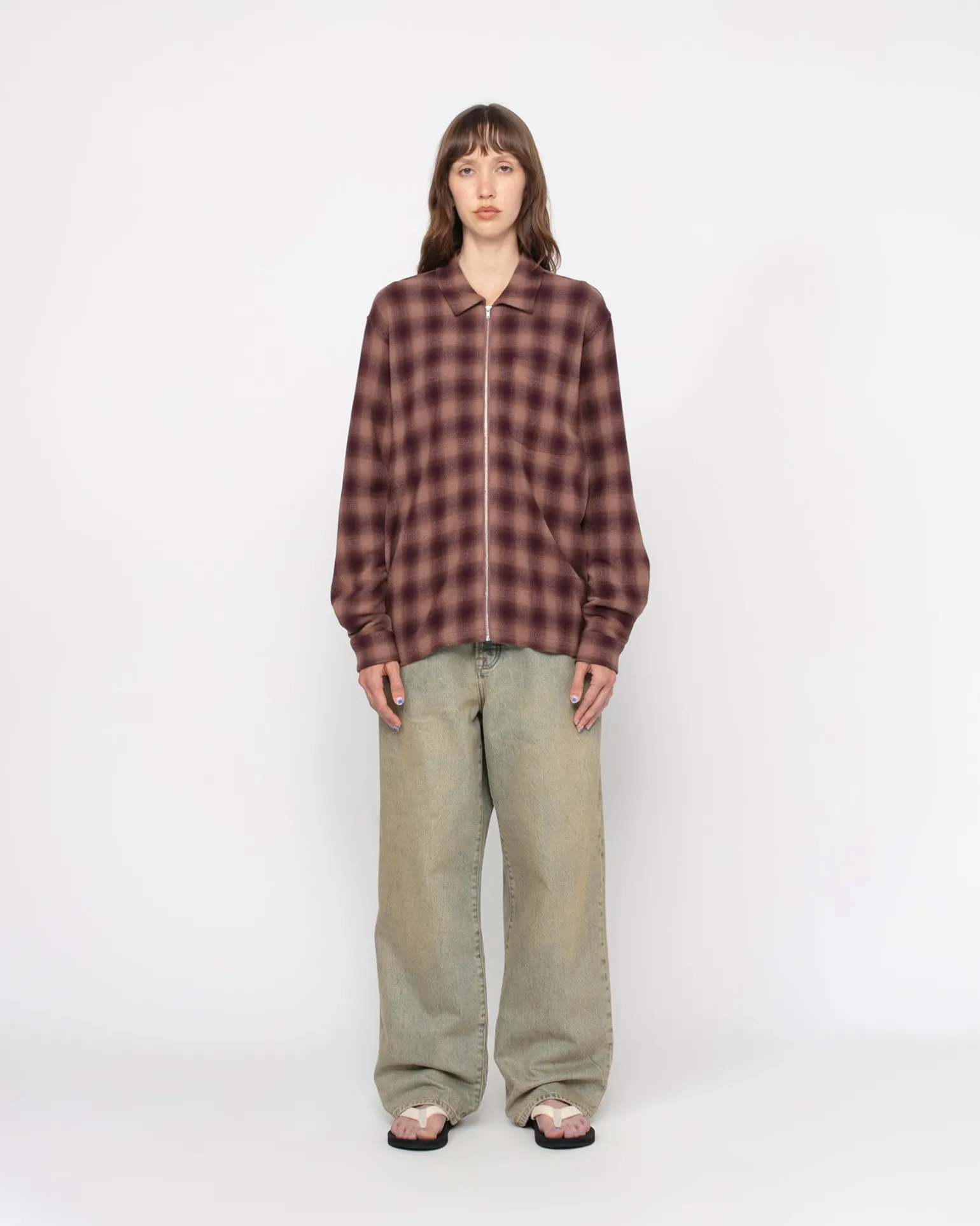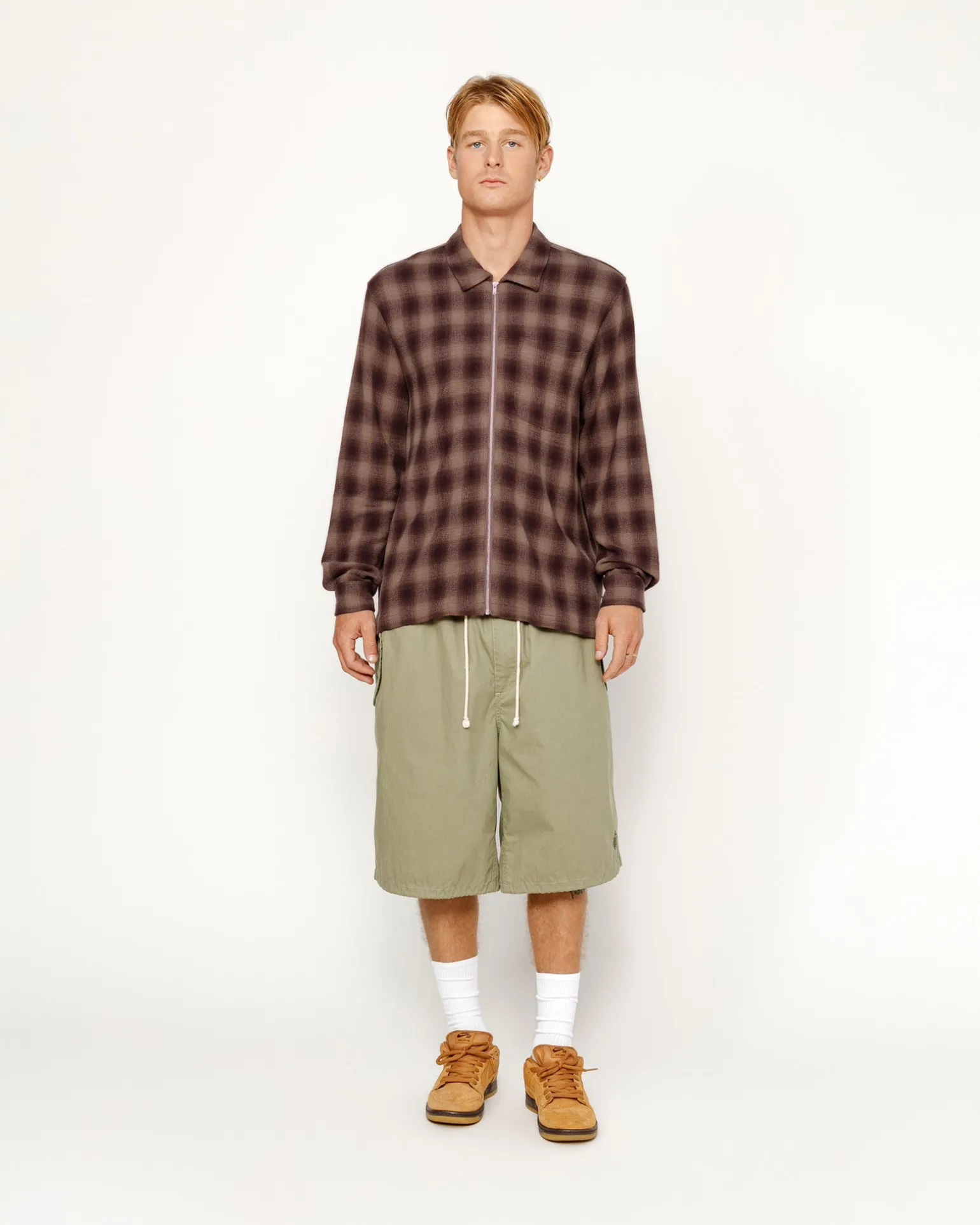 Weit geschnittenes, kariertes Hemd aus gezwirntem Baumwollgarn. Mit einem Reißverschluss, einer aufgesetzten Tasche und einem großen, aufgenähten Stüssy Stock Label an der Seite.